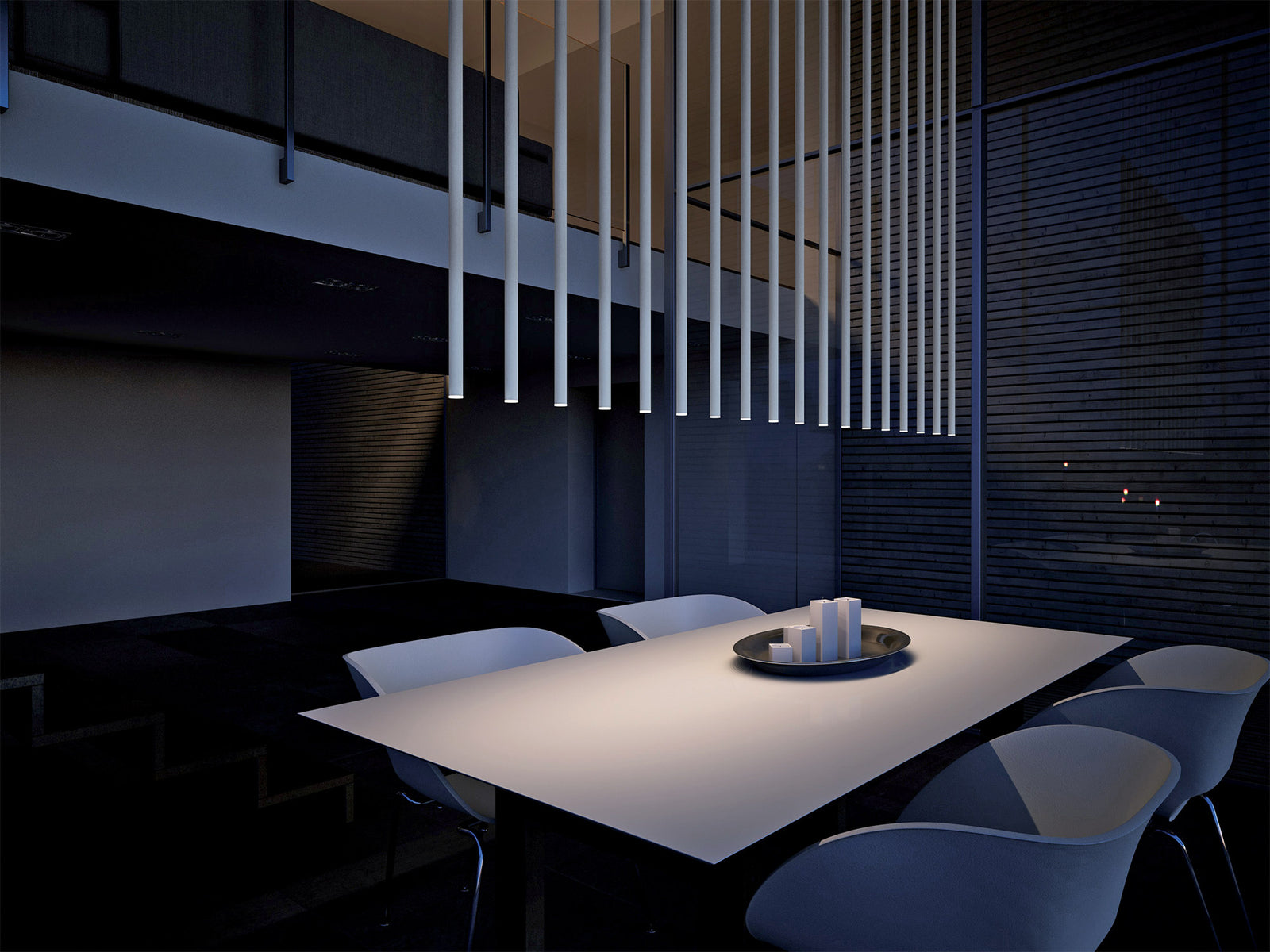 Furin, the Japanese word for 'wind chime', is a suspension system consisting of aluminum tube elements in which an LED light source is held. The pendants can be arranged along an electrical binary system or attached in groups to a ceiling rose. The system involves the use of tubes of differing lengths to create personalised designs, or to obtain a ground-line light effect: a wall of light. The Furin is available in matte white or a red textile finish, with other finishes available on request. The minimalist contemporary design and wide array of customisation options make the Furin an excellent choice for feature lighting in large scale commercial applications.