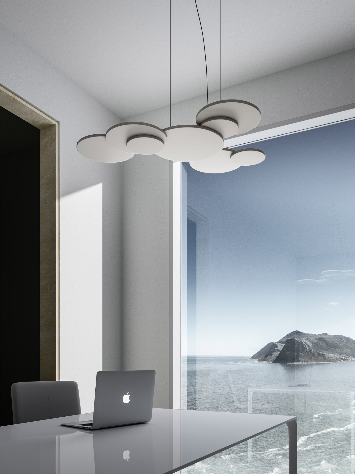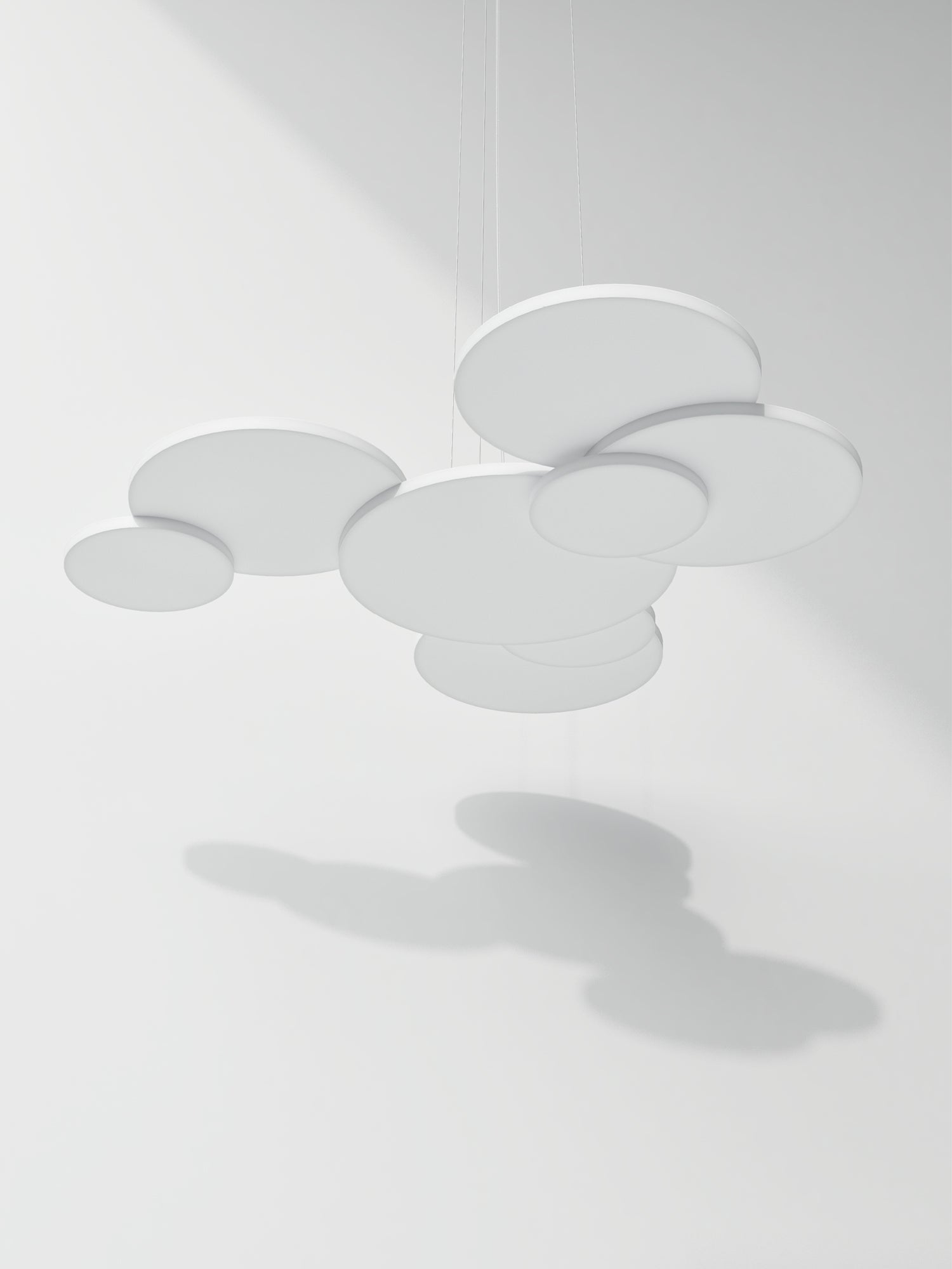 Overlap pendant takes it's name from the effect produced by it's overlapping of circular elements. Made entirely of aluminum and medium-density customization light panels. The central disk supports an LED source and the external disks arranged on different levels, producing an unobtrusive yet dramatic geometry. High output 34W 4000lm LED source with phase dimming. Available in matt white finish in 2700K or 3000K colour temperature.