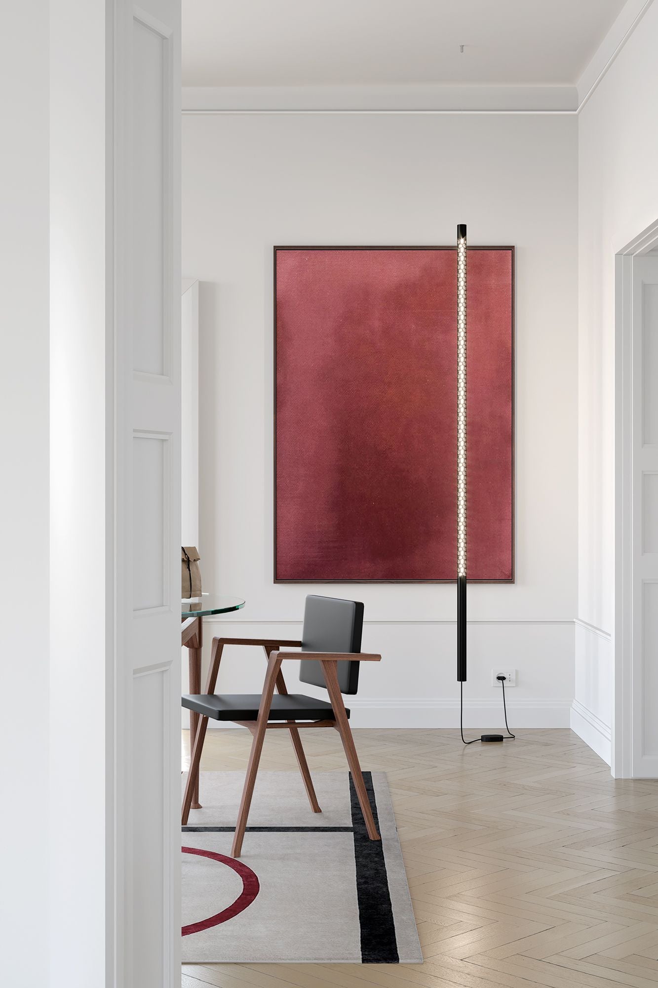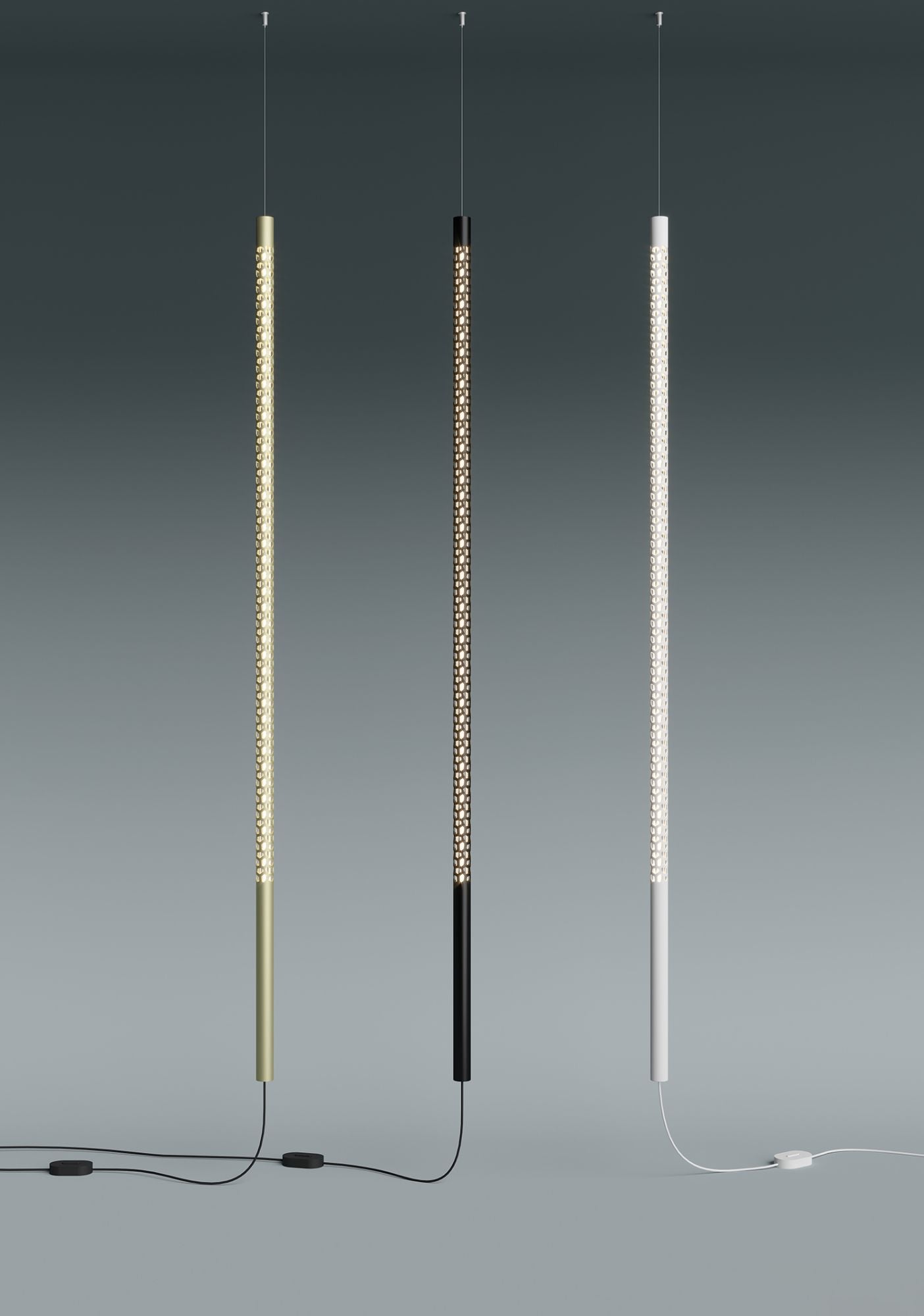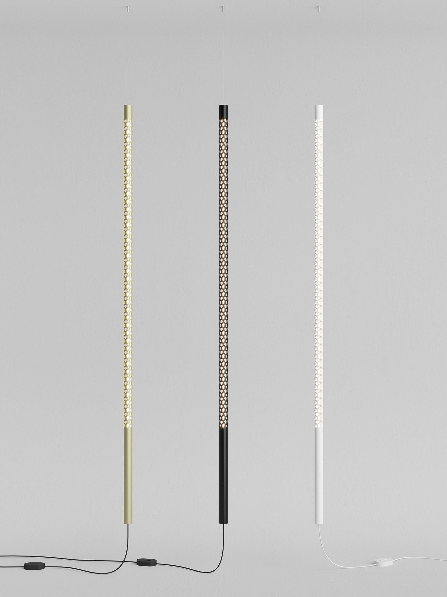 Inspired by the "Neon structure" by Lucio Fontana for the 9th Triennale of Milan, Squiggle is a suspended tubular exoskeleton containing an LED strip up to 6m long. A sequence of irregular hexagon-shaped holes allow light to escape the metal structure, projecting a complex array of geometric patterns, including broken curved lines and concentric rings. Squiggle comes in a wide range of designs and sizes to suit a myriad of installation possibilities, with all versions available in matt gold, black or white finish. Made in Italy.