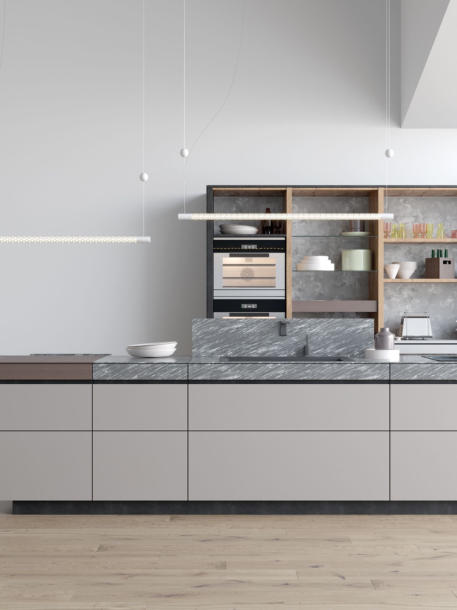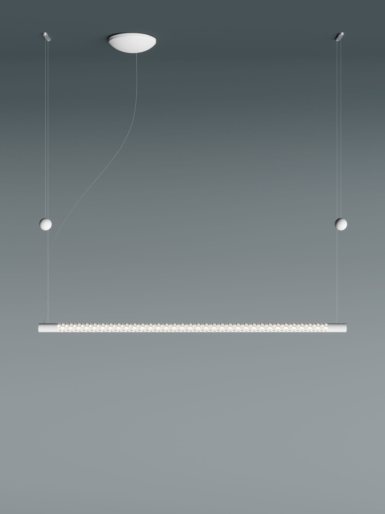 Inspired by the "Neon structure" by Lucio Fontana for the 9th Triennale of Milan, Squiggle is a suspended tubular exoskeleton containing an LED strip up to 6m long. A sequence of irregular hexagon-shaped holes allow light to escape the metal structure, projecting a complex array of geometric patterns, including broken curved lines and concentric rings. Squiggle comes in a wide range of designs and sizes to suit a myriad of installation possibilities, with all versions available in matt gold, black or white finish. Made in Italy.
