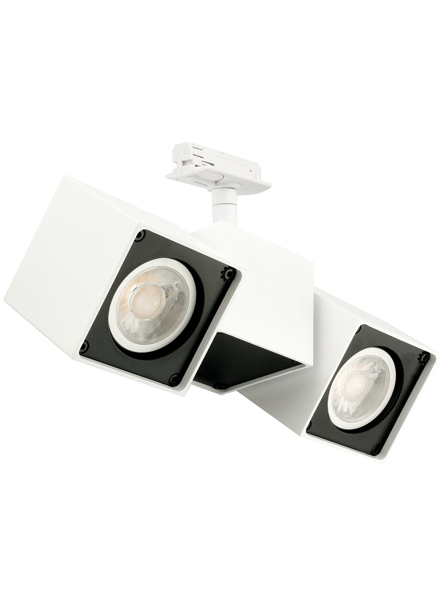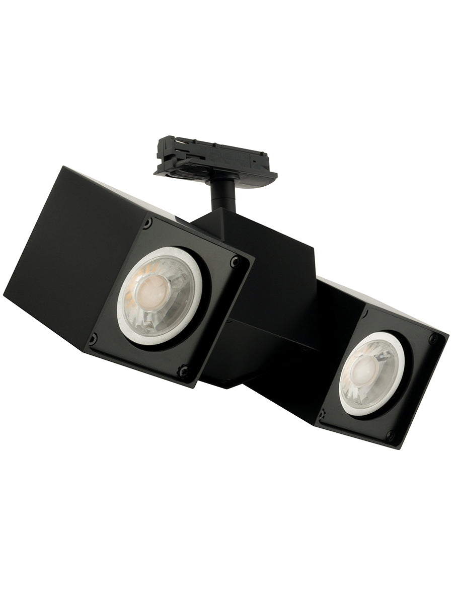 Squad Double is an adjustable track spot. Symmetrical design for universal applications. Made from extruded aluminium and equipped with 2 x GU10 35W (Max) LED or halogen globes for direct illumination. Compatible with single circuit track.