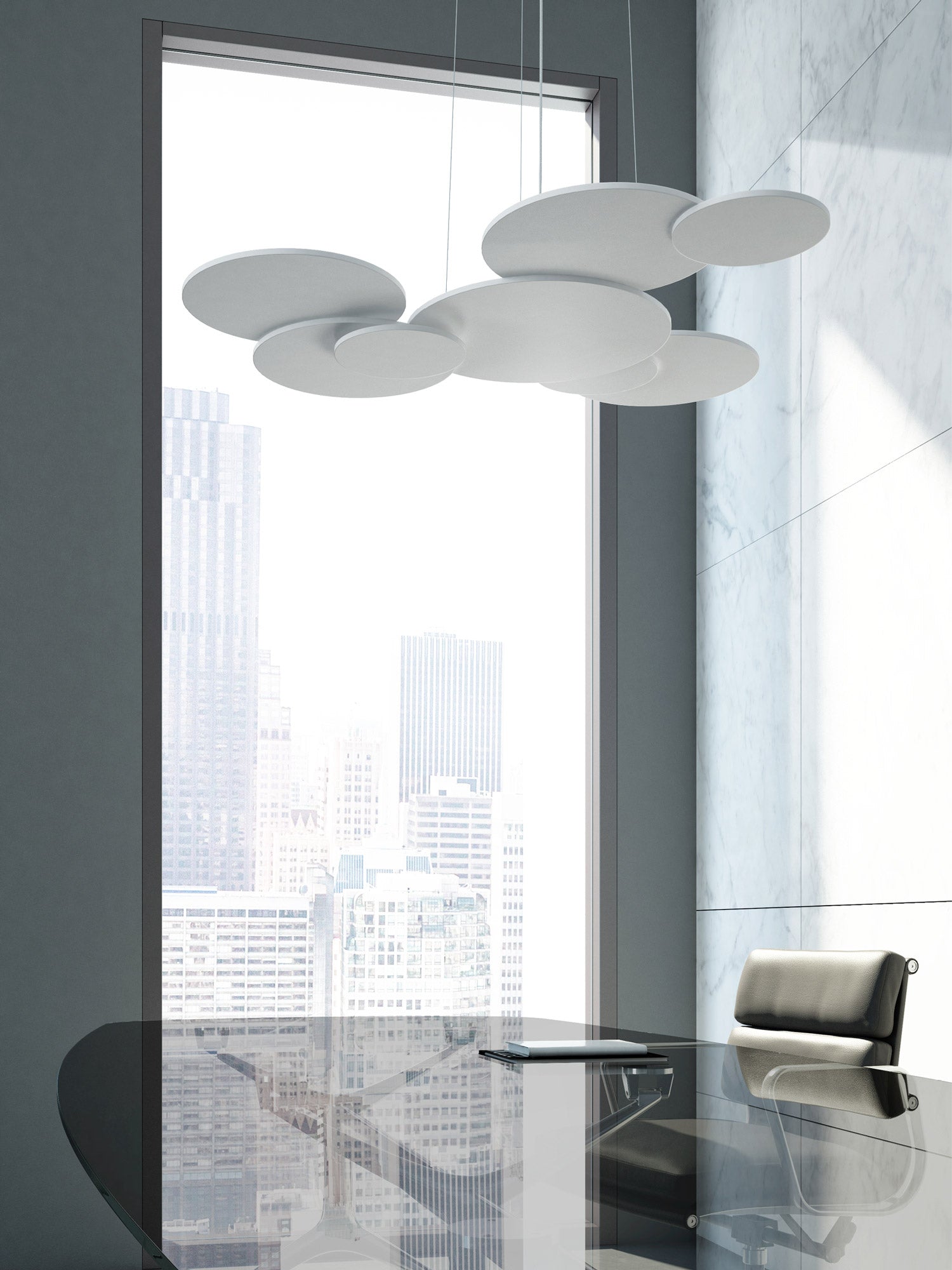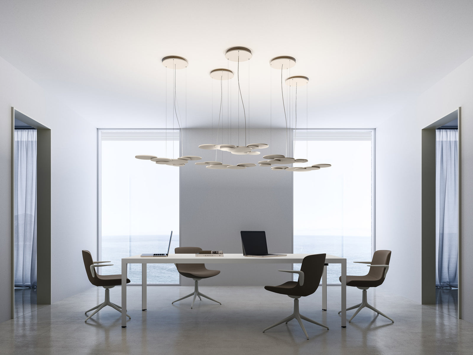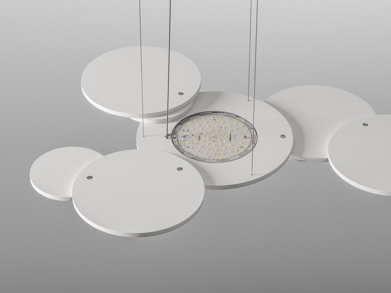 Overlap pendant takes it's name from the effect produced by it's overlapping of circular elements. Made entirely of aluminum and medium-density customization light panels. The central disk supports an LED source and the external disks arranged on different levels, producing an unobtrusive yet dramatic geometry. High output 34W 4000lm LED source with phase dimming. Available in matt white finish in 2700K or 3000K colour temperature.
