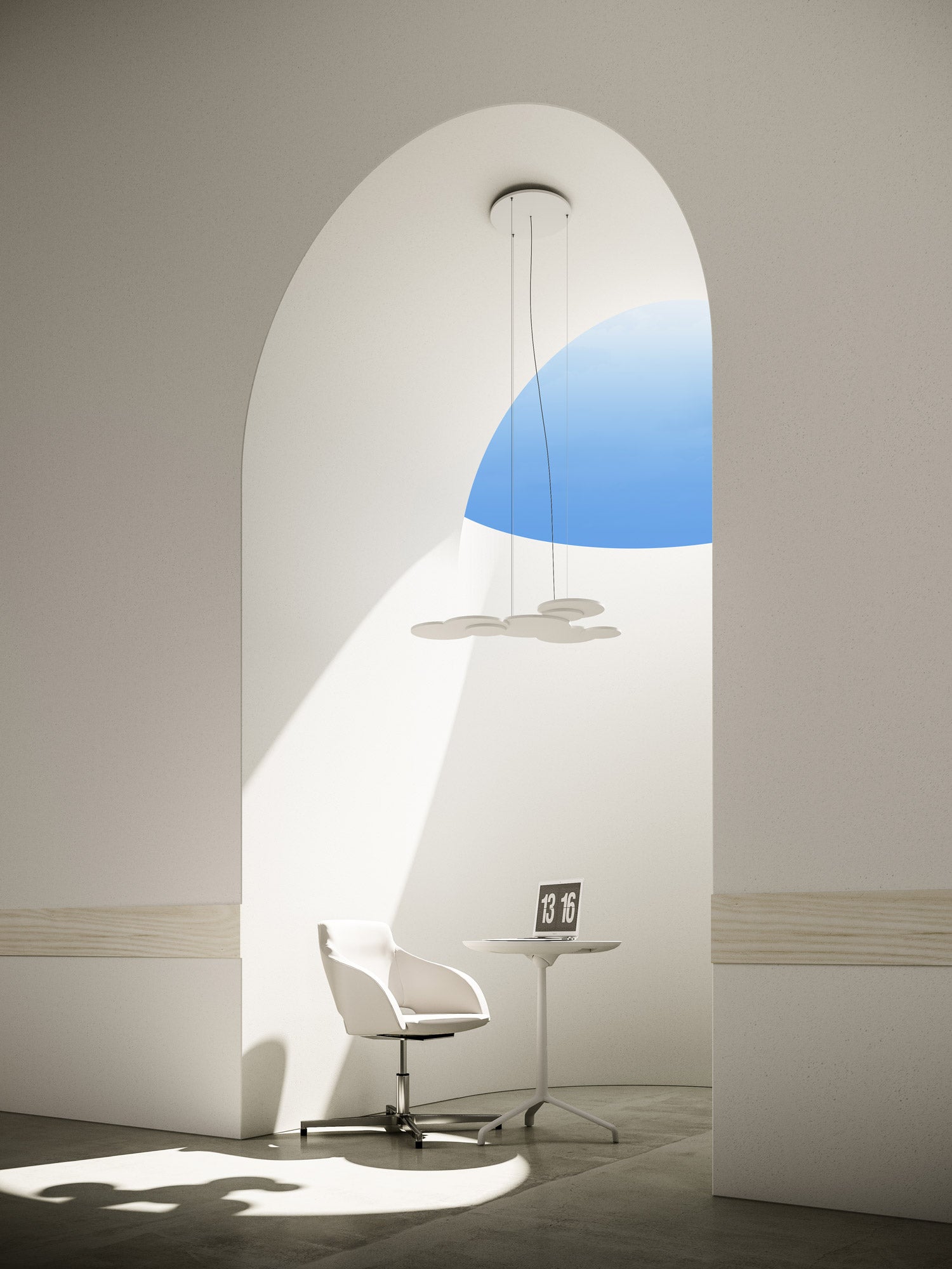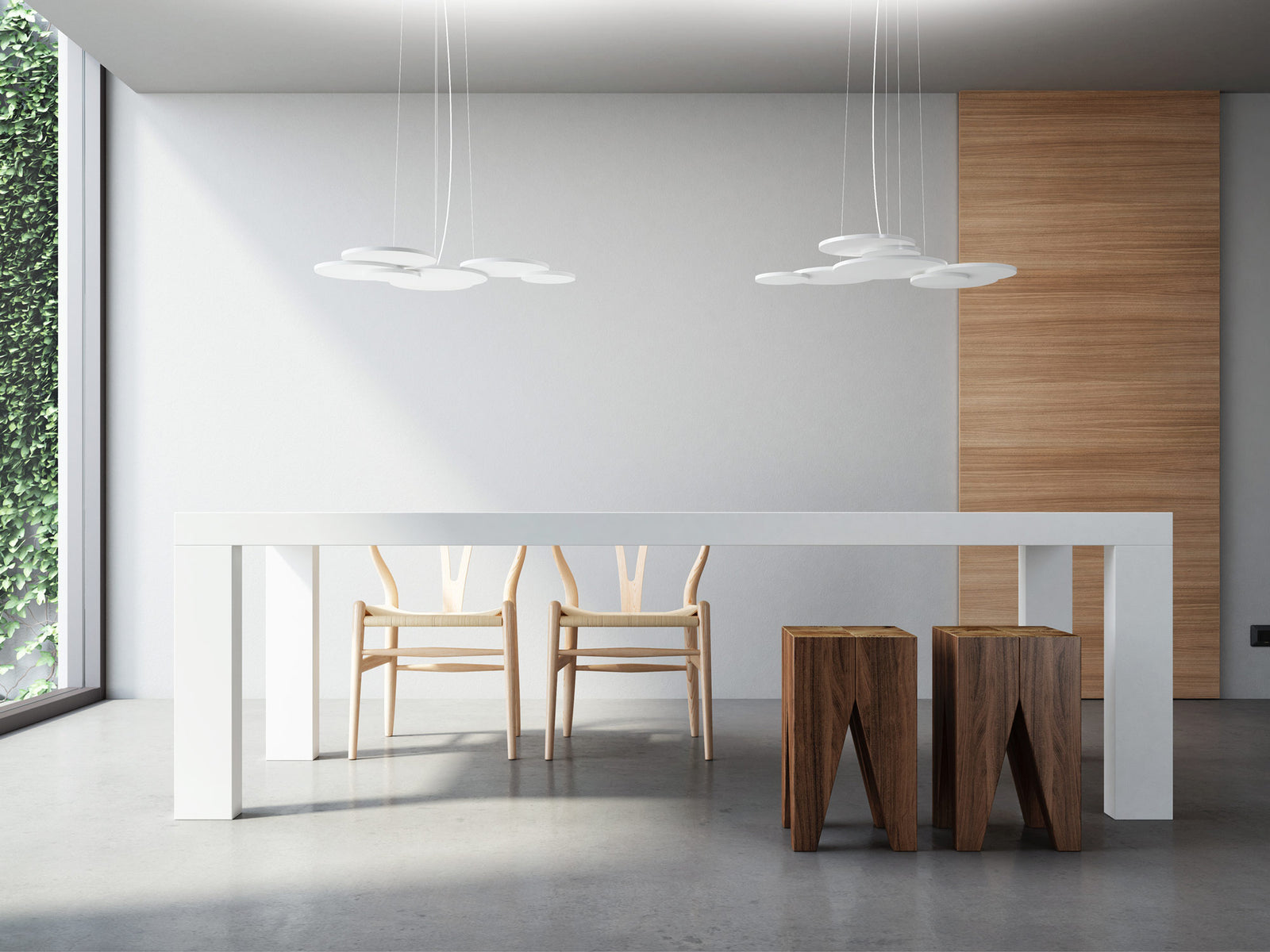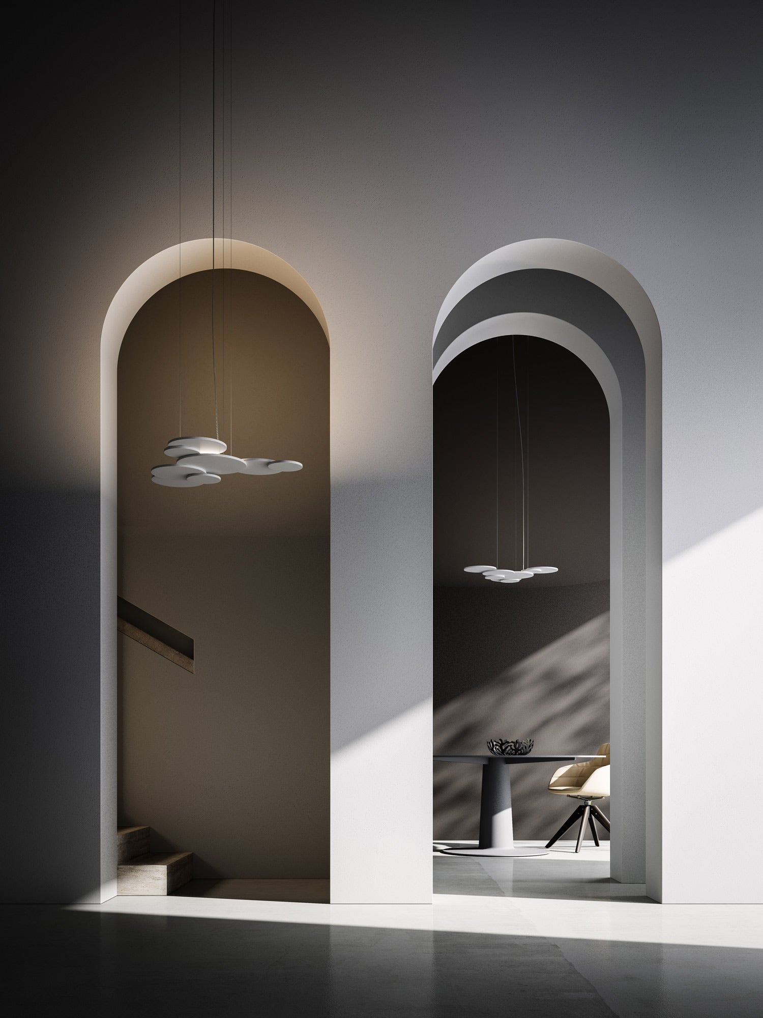 Overlap pendant takes it's name from the effect produced by it's overlapping of circular elements. Made entirely of aluminum and medium-density customization light panels. The central disk supports an LED source and the external disks arranged on different levels, producing an unobtrusive yet dramatic geometry. High output 34W 4000lm LED source with phase dimming. Available in matt white finish in 2700K or 3000K colour temperature.
