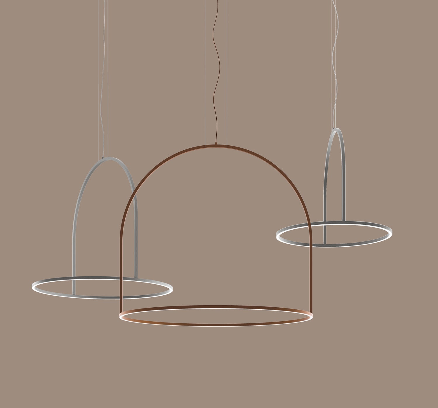 The U-Light collection by Timo Ripatti is composed of minimalist and lightweight circular aluminum elements which create a strong presence within a space. Contemporary in design and functionality, all models of the U-Light are equipped with cutting-edge dimmable LED technology. The simple geometric aesthetic of the U-Light is perfectly suited to modern interiors as accent lighting in smaller spaces or feature applications in large commercial projects. The U-Light hoop pendant is available in 90cm to 160cm diameter sizes in anthracite grey or rust brown finish. A sound absorbing version is also available upon request.