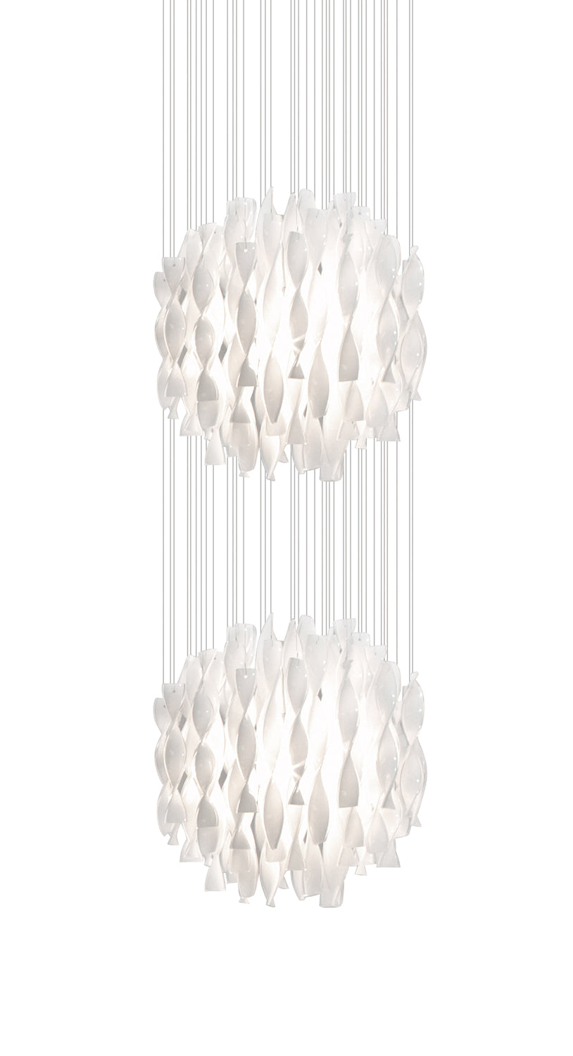 Aura by Manuel Vivian features waves of light and dynamic reflections. The expertise and craftsmanship of a master glassmaker is expressed in the shape of the small glass ribons that together compose a fluid and aquatic form with a diffused glow. Aura double tier pendant light is available in two sizes with white, red, tea or crystal glass with a polished chrome mounting plate.