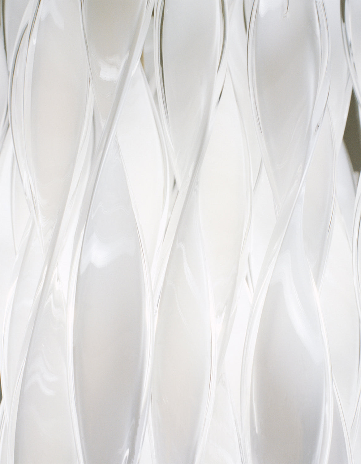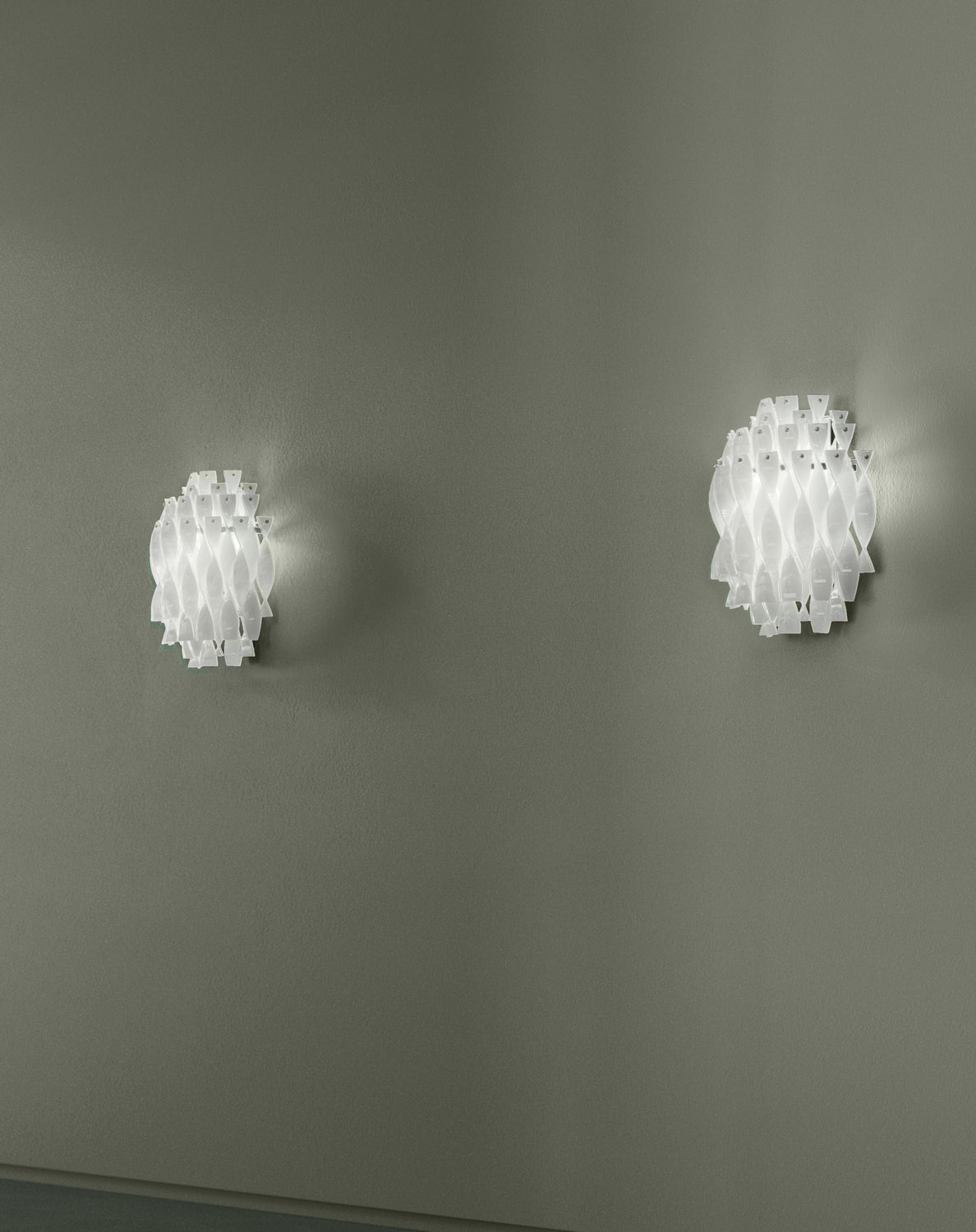 Aura by Manuel Vivian features waves of light and dynamic reflections. The expertise and craftsmanship of a master glassmaker is expressed in the shape of the small glass ribons that together compose a fluid and aquatic form with a diffused glow. Aura wall light is available with white, red, tea or crystal glass with a polished chrome mounting plate.