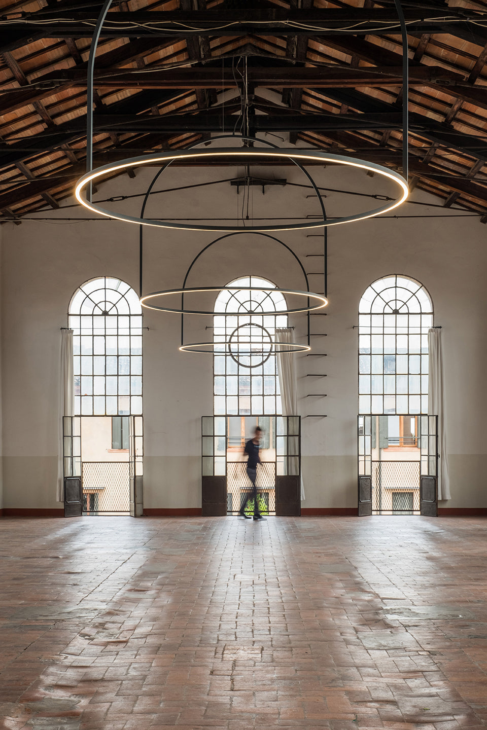 The U-Light collection by Timo Ripatti is composed of minimalist and lightweight circular aluminum elements which create a strong presence within a space. Contemporary in design and functionality, all models of the U-Light are equipped with cutting-edge dimmable LED technology. The simple geometric aesthetic of the U-Light is perfectly suited to modern interiors as accent lighting in smaller spaces or feature applications in large commercial projects. The U-Light hoop pendant is available in 90cm to 160cm diameter sizes in anthracite grey or rust brown finish. A sound absorbing version is also available upon request.