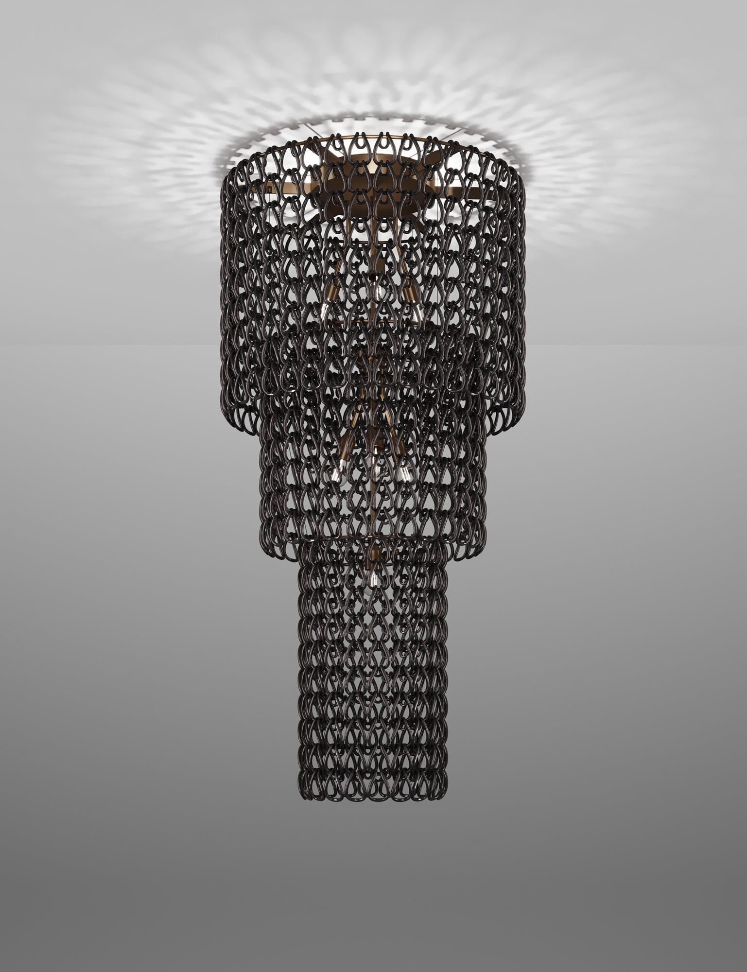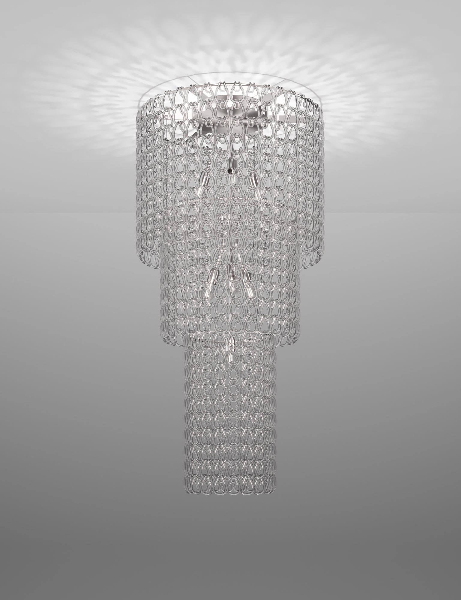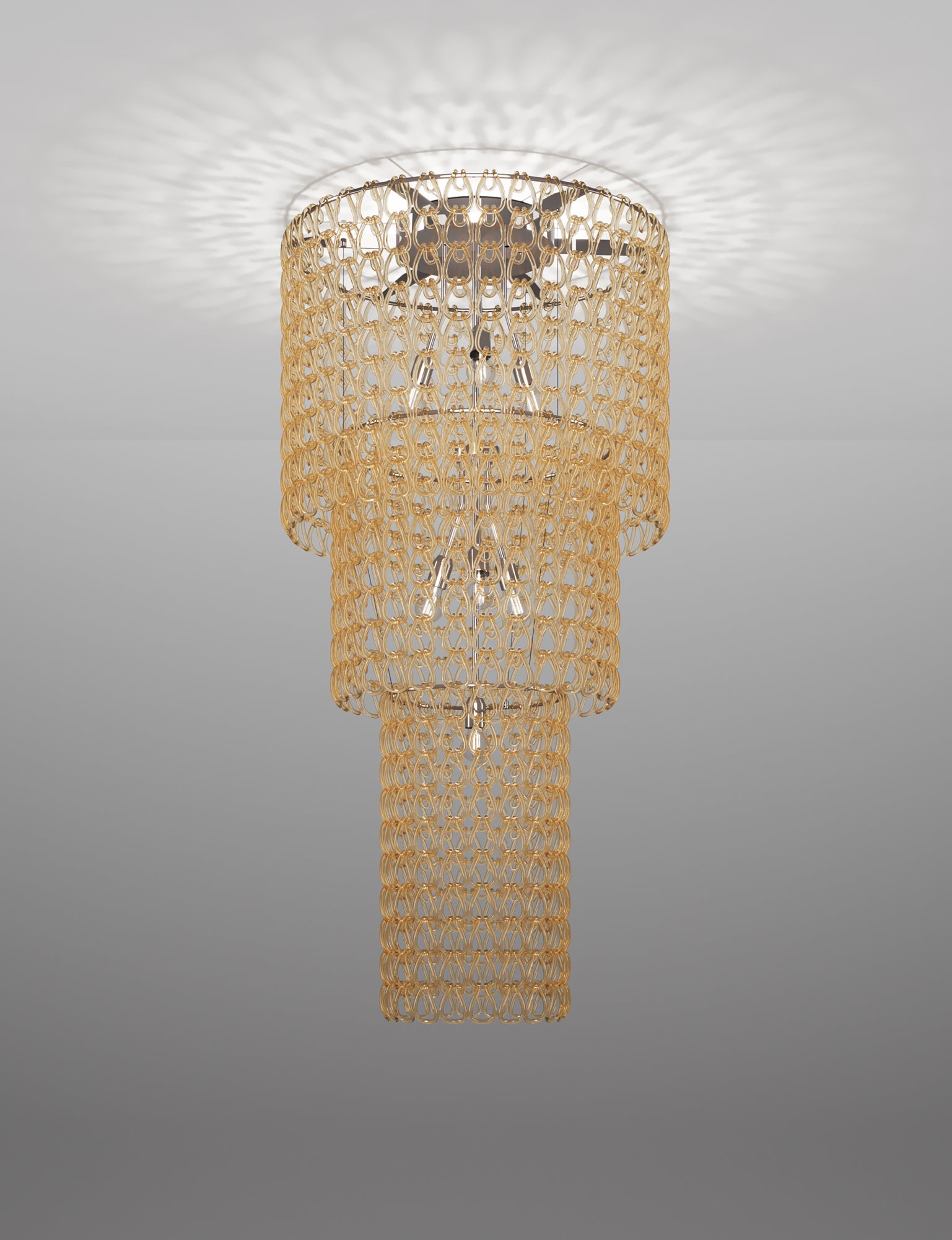The Minigiogali collection from Vistosi expands Angelo Mangiarotti's classic Giogali range through utilising smaller hand made crystal links, providing additional style options. The Minigiogali feature ceiling light is extra large and ideal for feature lighting installations in large-scale commercial projects. Comes with a bronze or chrome frame and a variety of different link colour options. Available in a variety of sizes.
