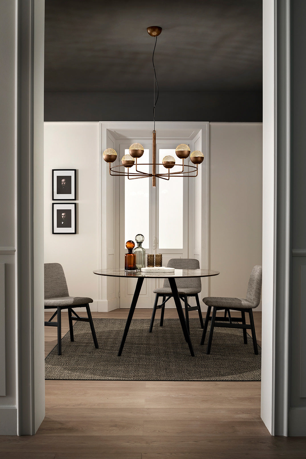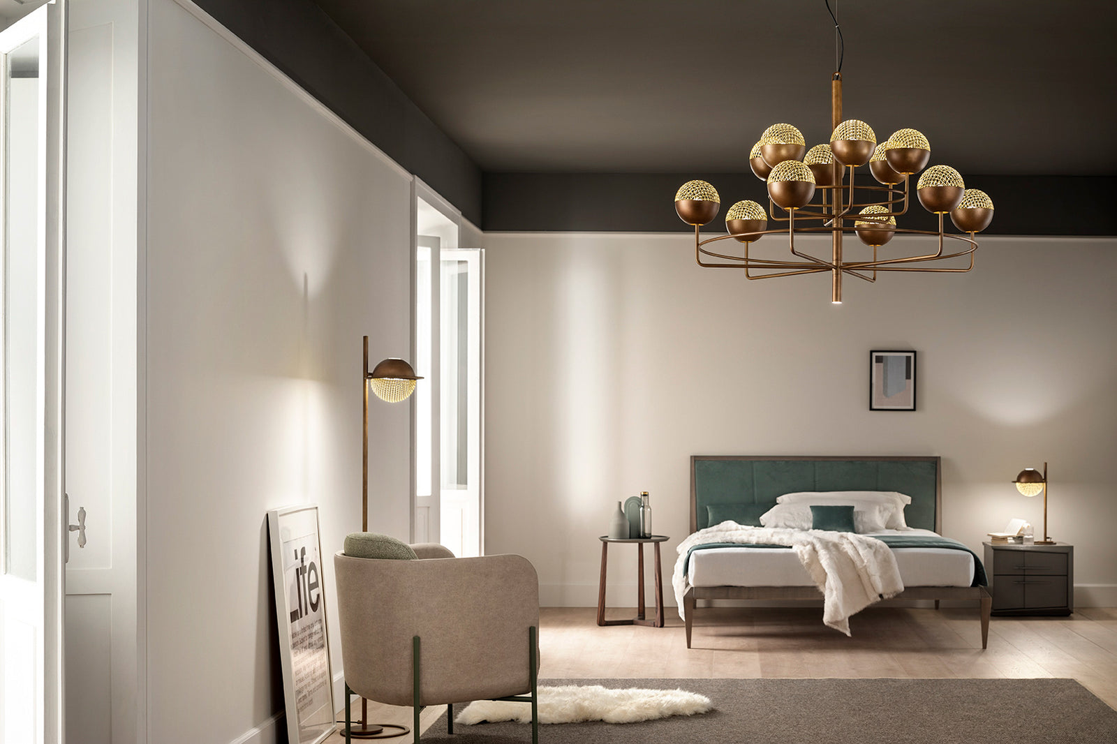 Iglu is an intuition born from observing the perfection of the sphere. A mesh grate seamlessly completes the metal sphere and shields the light source, creating a pattern of light and shadow. Metal structure painted with brushed patina. Designed by Oriano Favaretto and made in Italy.
