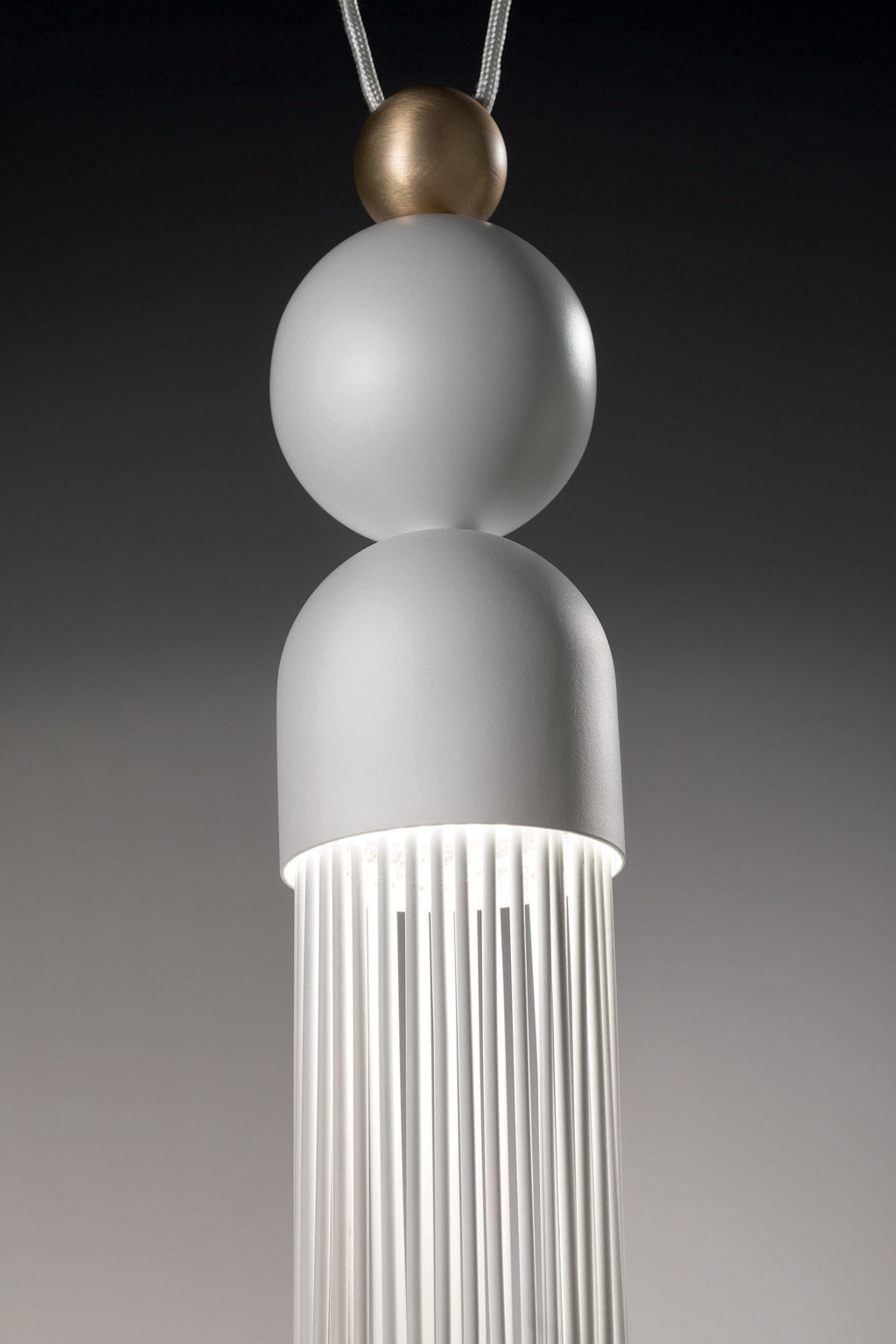 Made in Italy, the Nappe pendant collection is inspired by the 'nappine' (tassels) typically used to close curtains and decorate Venetian salons. Each Nappe is comprised of a painted metal frame with metal or Pyrex rods and Pyrex diffusors with an inbuilt LED source. The Nappe chandelier is ideal for feature lighting applications in dining and living areas. Available in several configurations.