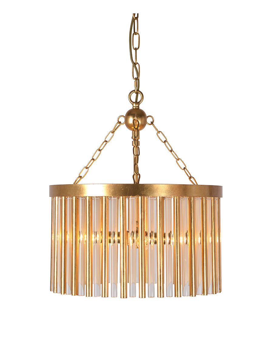 The Seattle Chandelier is an elegant decorative light fitting reminiscent of art deco design. A sequence of metal and clear glass rods encircle the light source, acting as diffuser to create a subtle ambient lighting effect, making it well suited to feature lighting applications in medium to large spaces. Seattle is available as a 4, 6 or 8 light version in antique silver or gold finish.