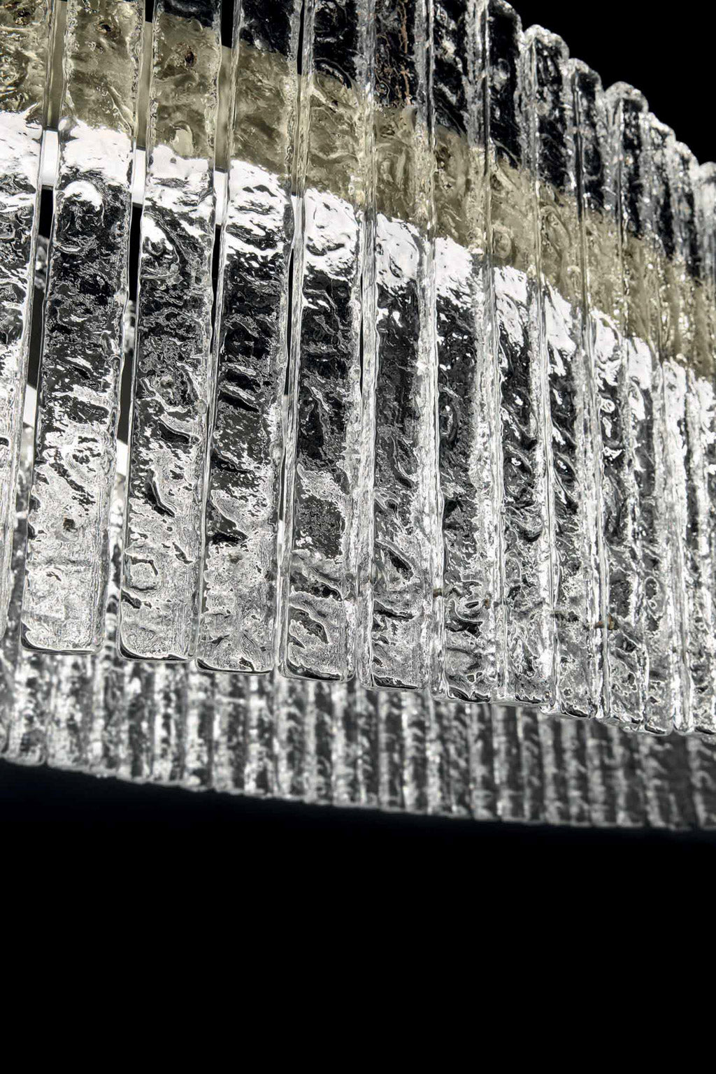 Vegas is loosely inspired by the architecture of Las Vegas, the city that never sleeps. The Vegas oval chandelier expertly incorporates geometric forms, high-quality materials and cutting-edge manufacturing techniques to create a piece that reinterprets classic Art Deco style in a contemporary key. Hand-made glass pendants with rock-like details make up the diffuser, while a champagne-leaf metal frame provides an elegant base housing an in-built LED source. Perfect for feature lighting applications, Vegas is available in a variety of sizes. Designed by Marc Sadler and made in Italy.
