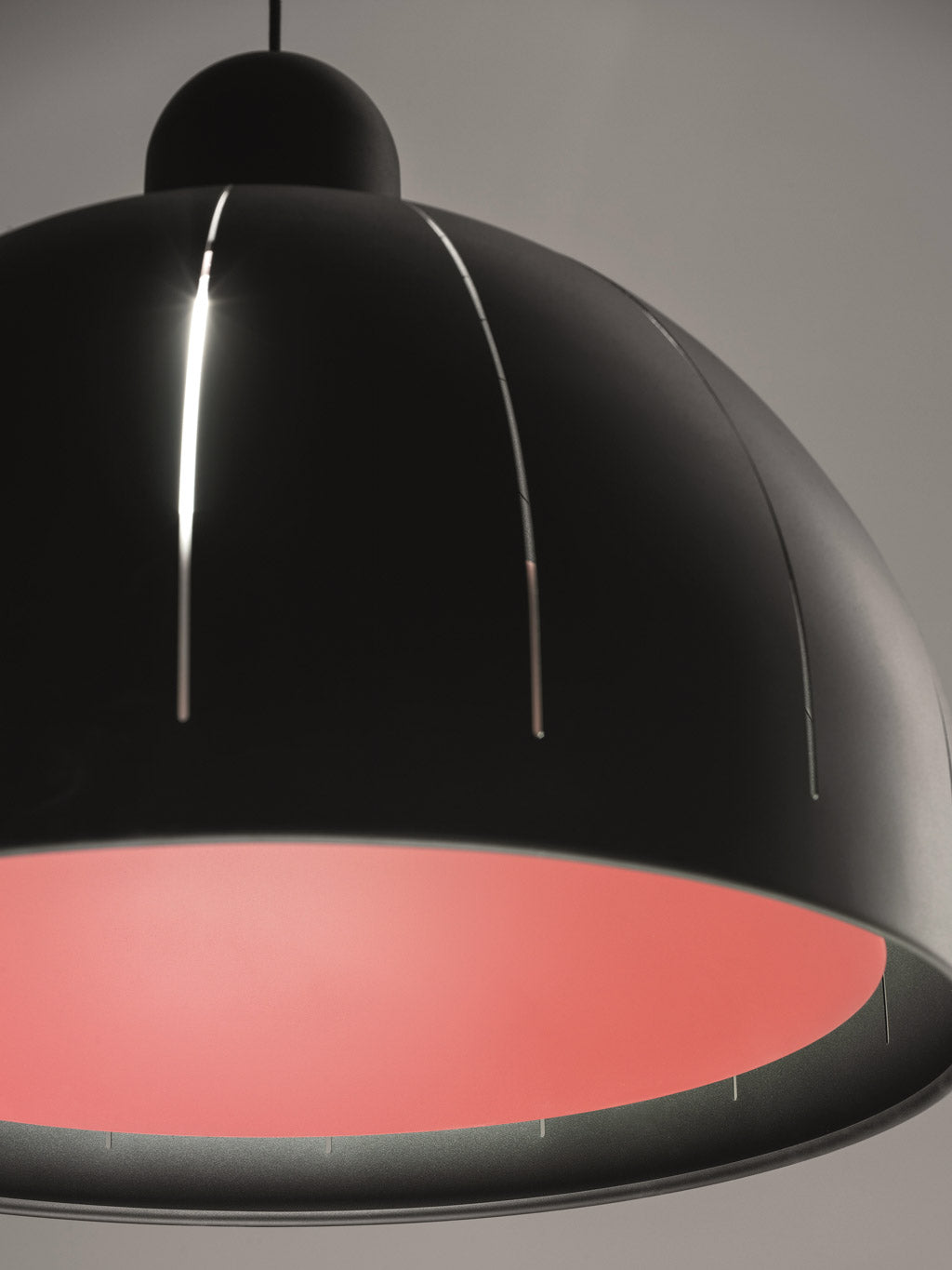 The Cupole pendant light is a tribute to the skyline of Venice. Inspired by the churches that trace romantic curves across the Venetian horizon, Cupole's clean dome shape is accented with linear apertures which reveal the light source. Composed of a painted metal dome with an inbuilt LED. Cupole is available in a variety of sizes and internal and external finish combinations. Made in Italy by Masiero.