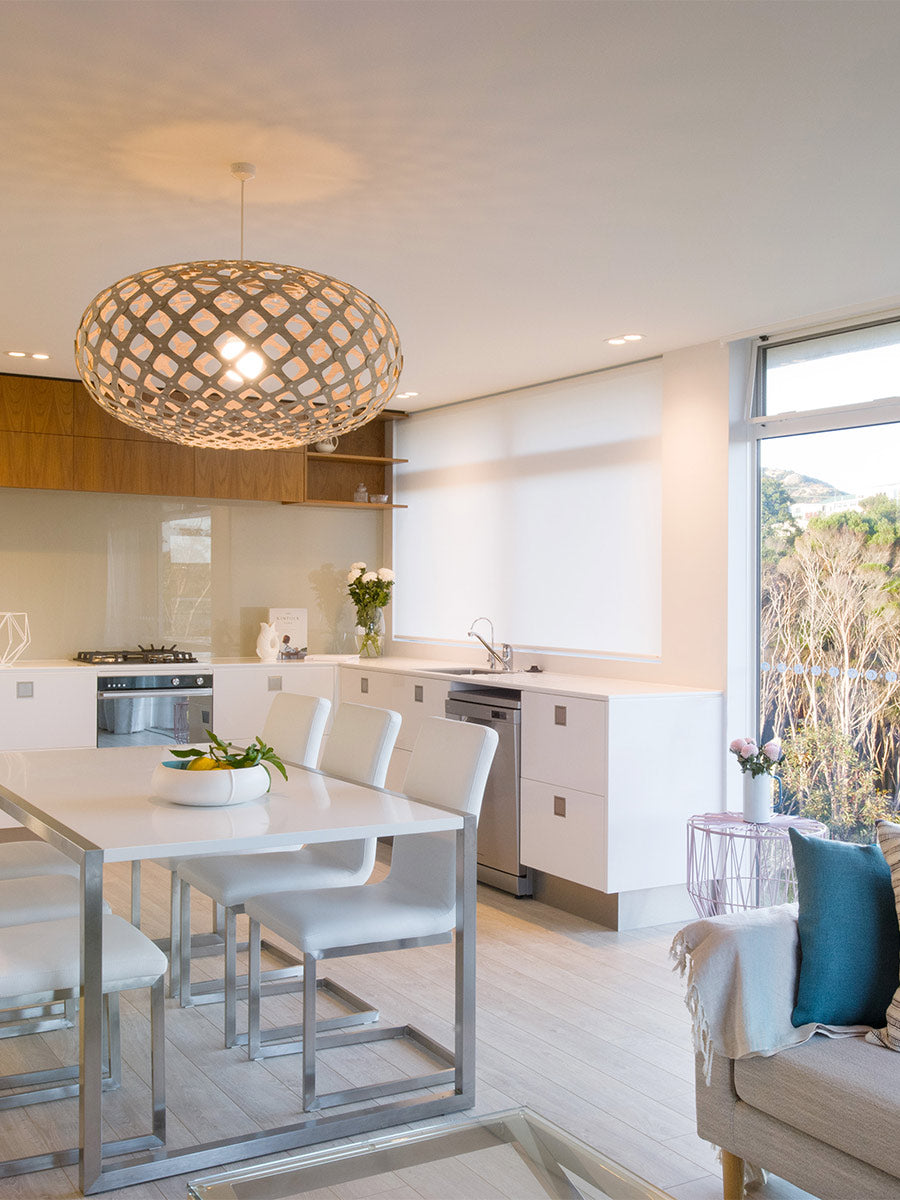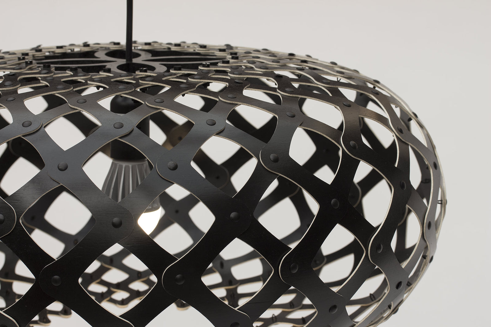 Kina is the Maori name for the local sea-urchin. Under the spines the shell is shaped like this with similar surface patterns. David Trubridge was inspired after seeing a tiny one in Antarctica, sunk in the sea ice in a hollow that was made when the shell absorbed the warmth from the sun and melted the ice around it - an exquisite jewel. The Kina comes in kitset to reduce the impact of freight on the environment.