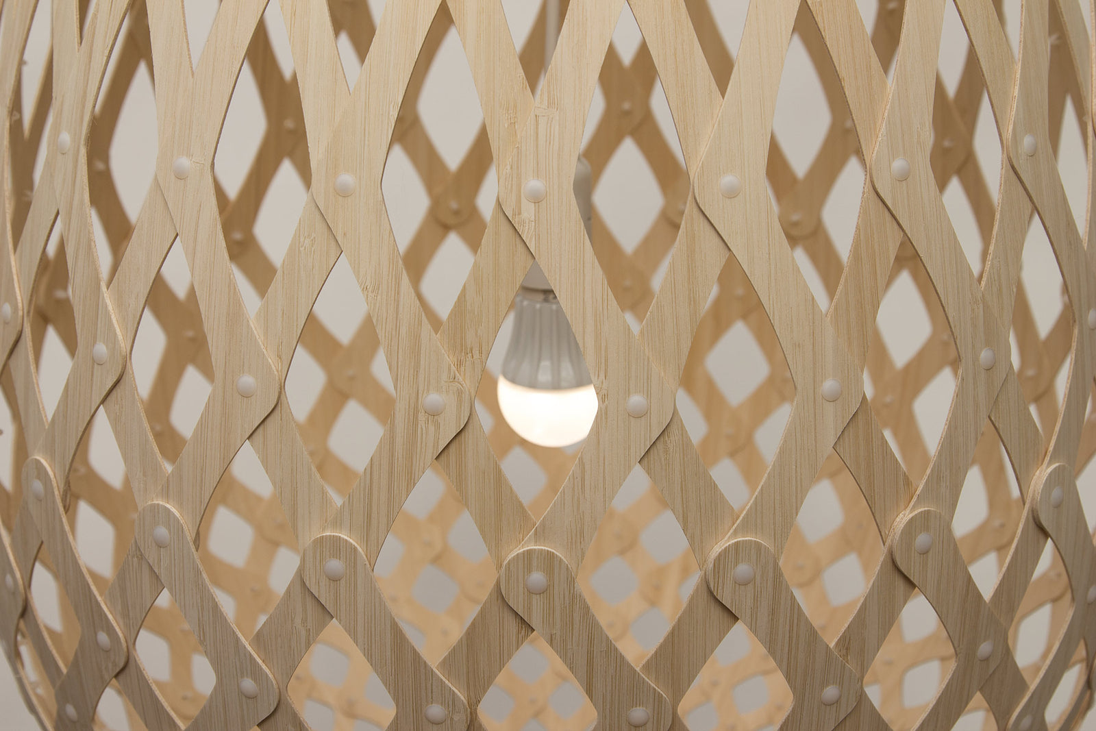 The Koura pendant light was inspired by woven baskets and from the curled form of the New Zealand native freshwater shrimp, koura, which is its Maori name. The Koura comes in various sizes and the bamboo can be painted inside in numerous colours, or both sides in black and white. The Koura comes in kitset to reduce the impact of freight on the environment.