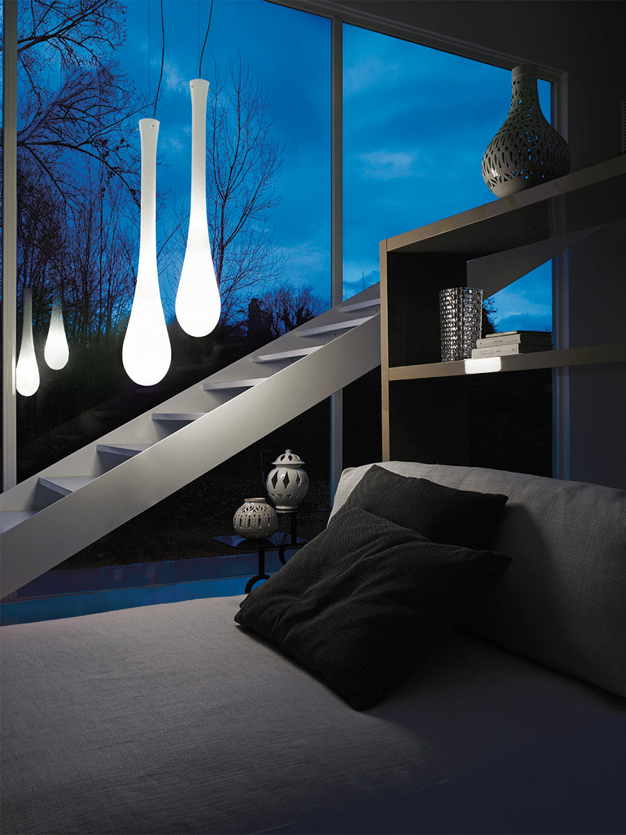 The Lacrima Pendant features a white elongated tear drop design that makes it perfect for staircases, voids and high ceilings amongst other applications. Lacrima is available in two sizes. Hand made in Italy by Vistosi.