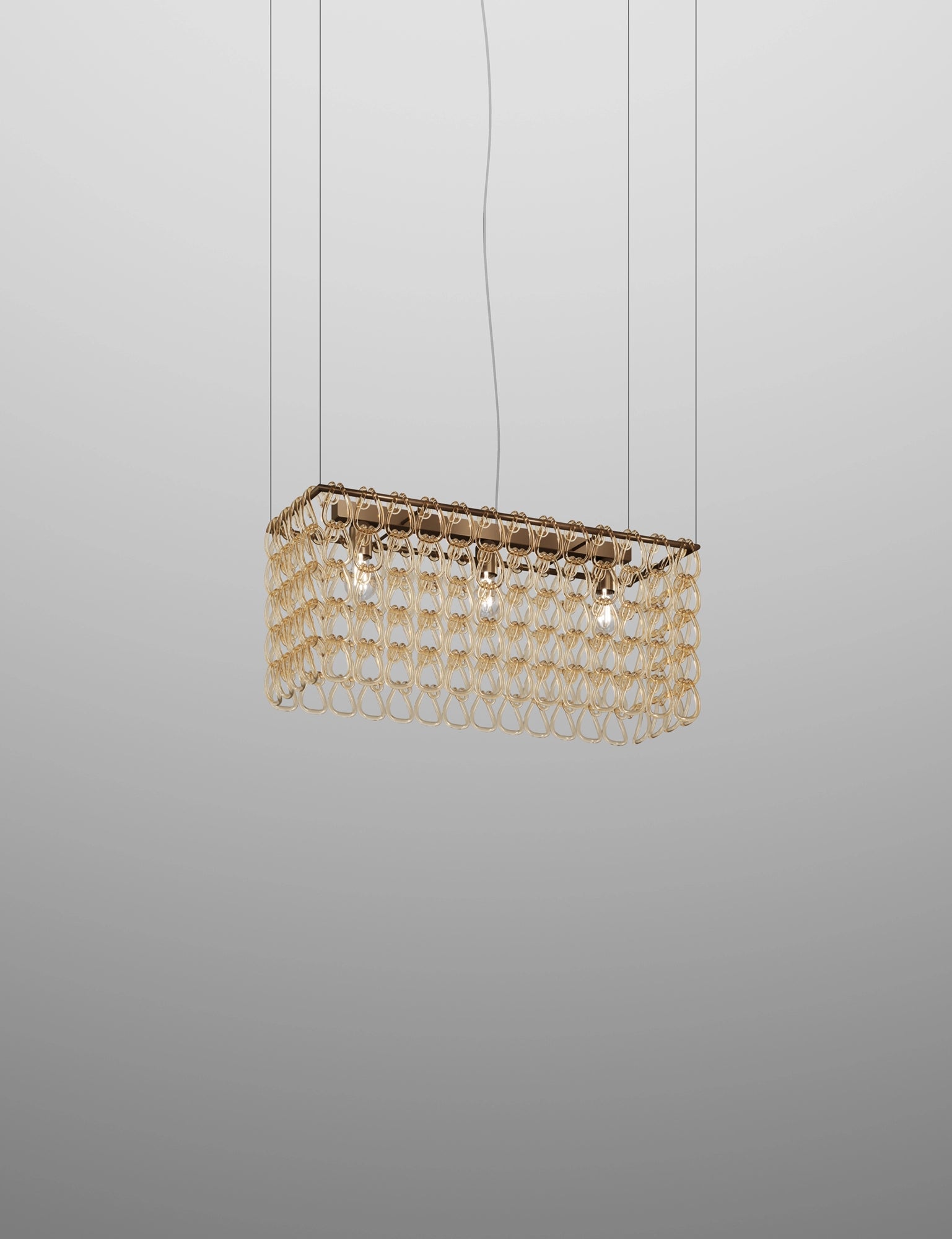 The Minigiogali collection from Vistosi expands Angelo Mangiarotti's classic Giogali range through utilising smaller hand made crystal links, providing additional style options. The Minigiogali Rectangle Chandelier comes with a bronze or chrome frame and a variety of different link colour options. Ideal for feature lighting installations in residential and commercial projects.