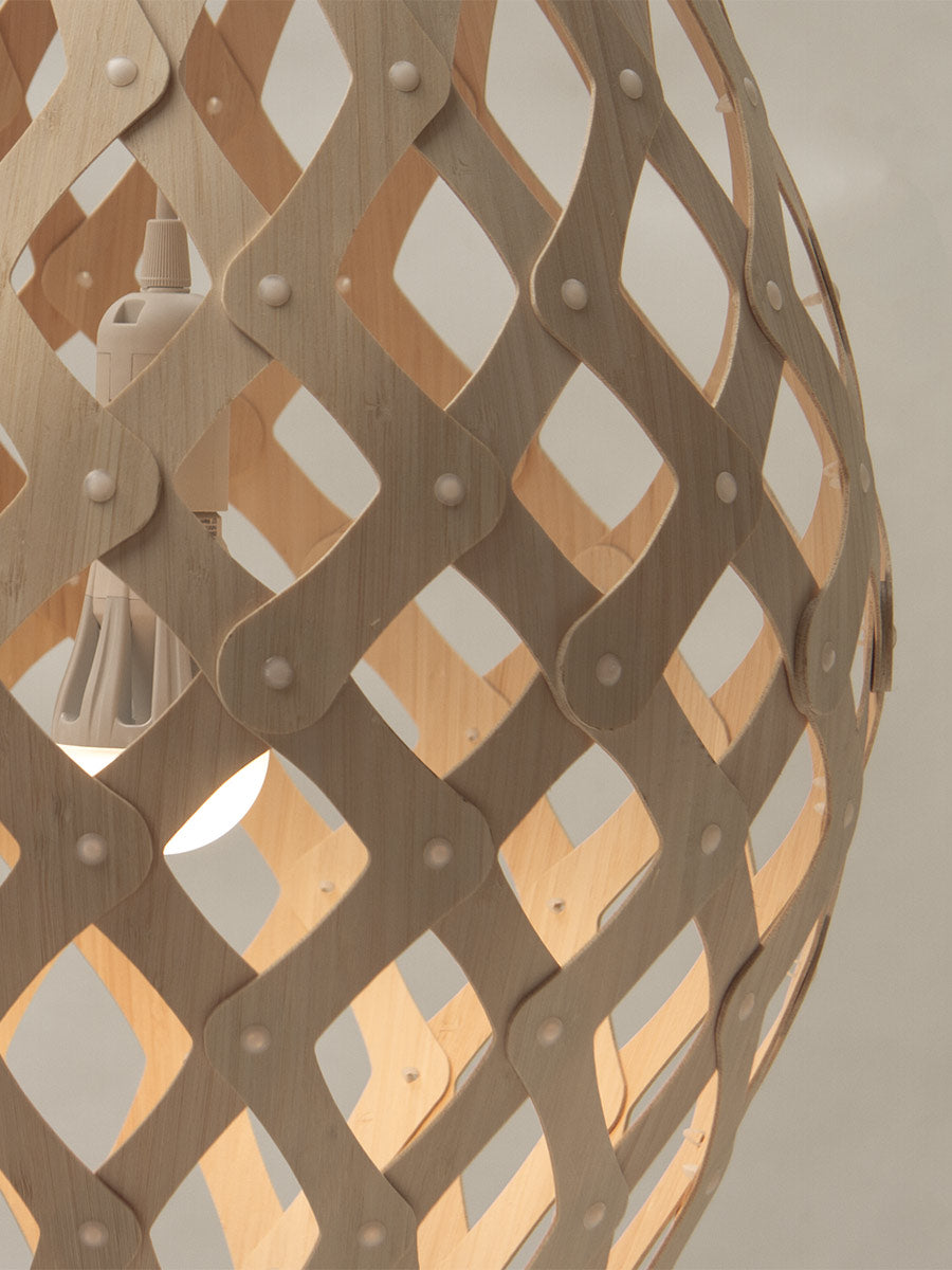 Nikau is the name of the only indigenous palm tree in New Zealand. It has a large bulb at the top of its trunk and its leaves overlap in similar patterns. The Nikau Pendant's bamboo can be painted inside in numerous colours, or both sides in black and white. The Nikau comes in kitset to reduce the impact of freight on the environment.