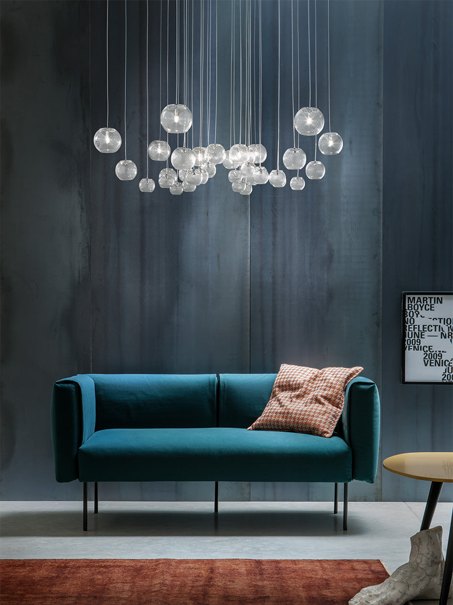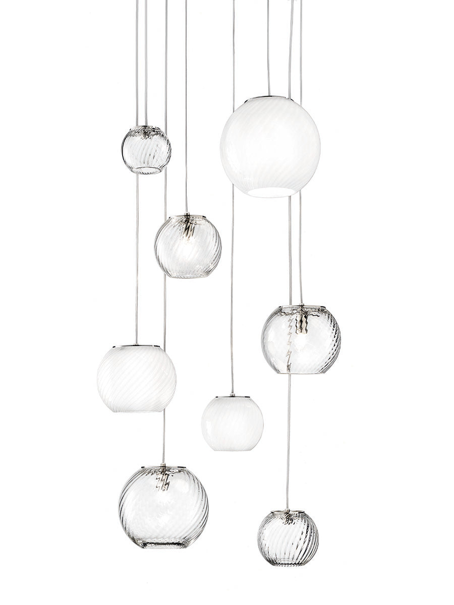 The Spherical Oto is a Murano blown glass Collection designed by Pio and Tito Toso for Vistosi. The Oto is available in three different sized single pendants as well as a stunning array of clusters and formations. The ribbed blown glass comes in transparent finish.