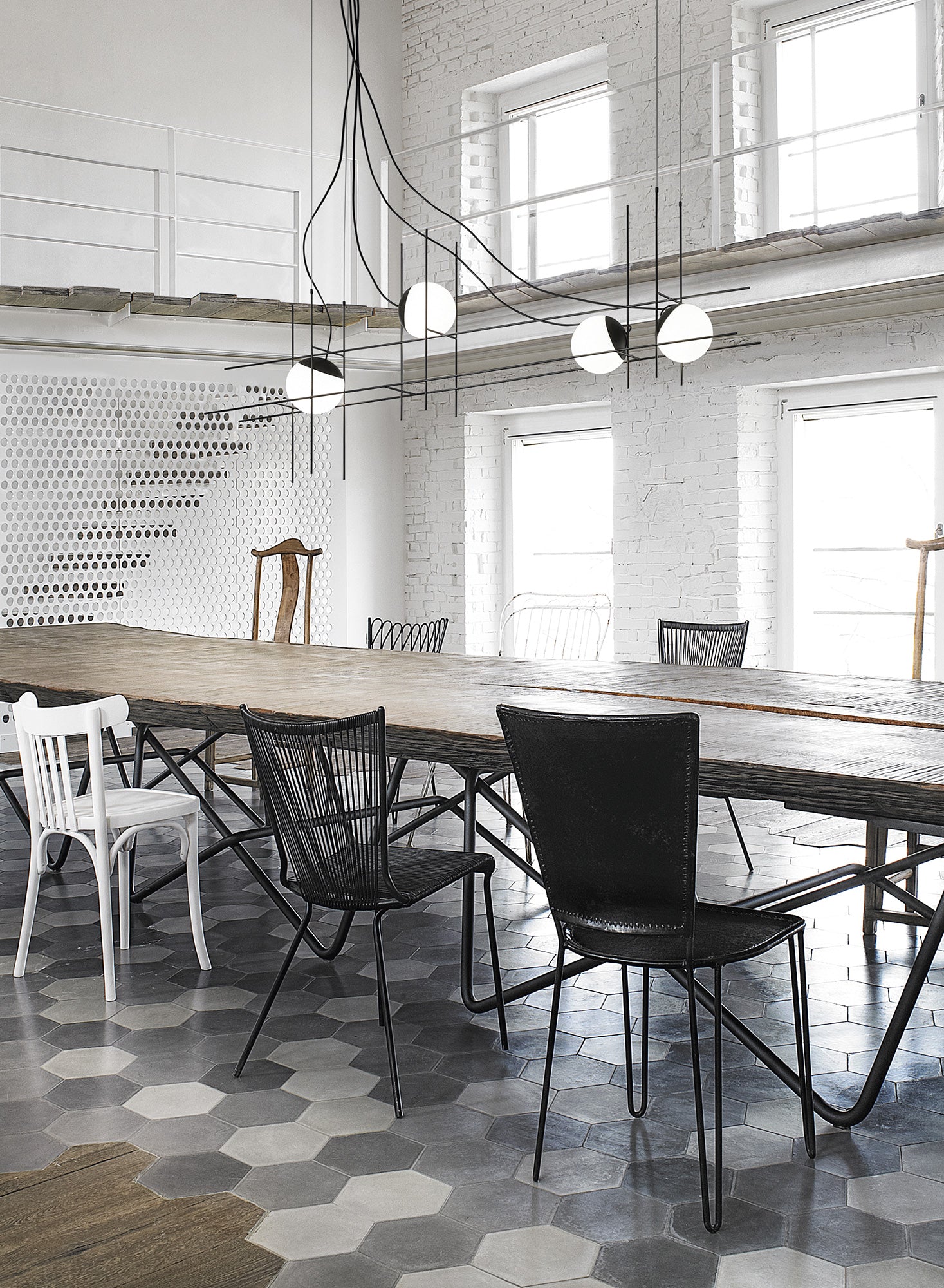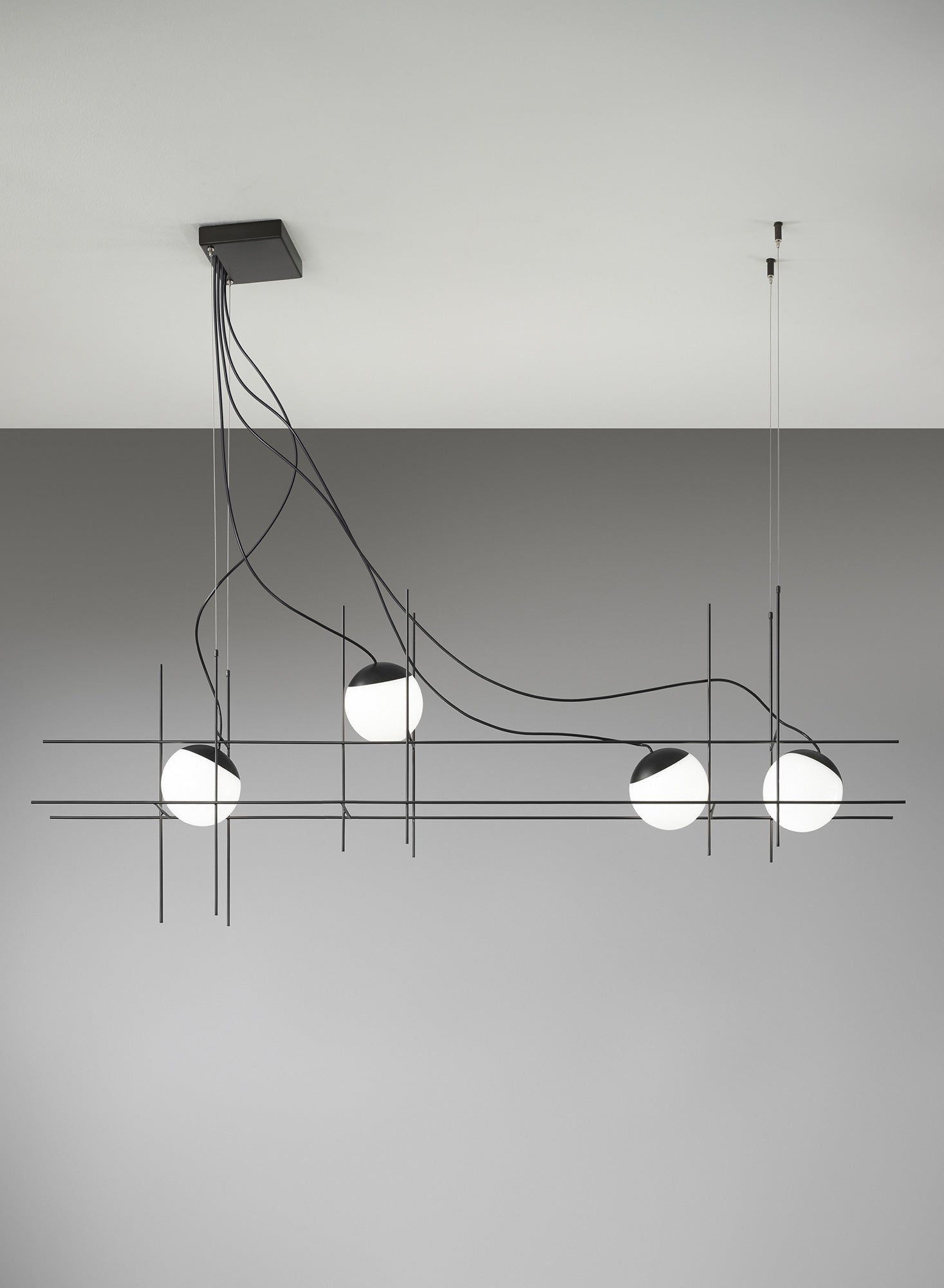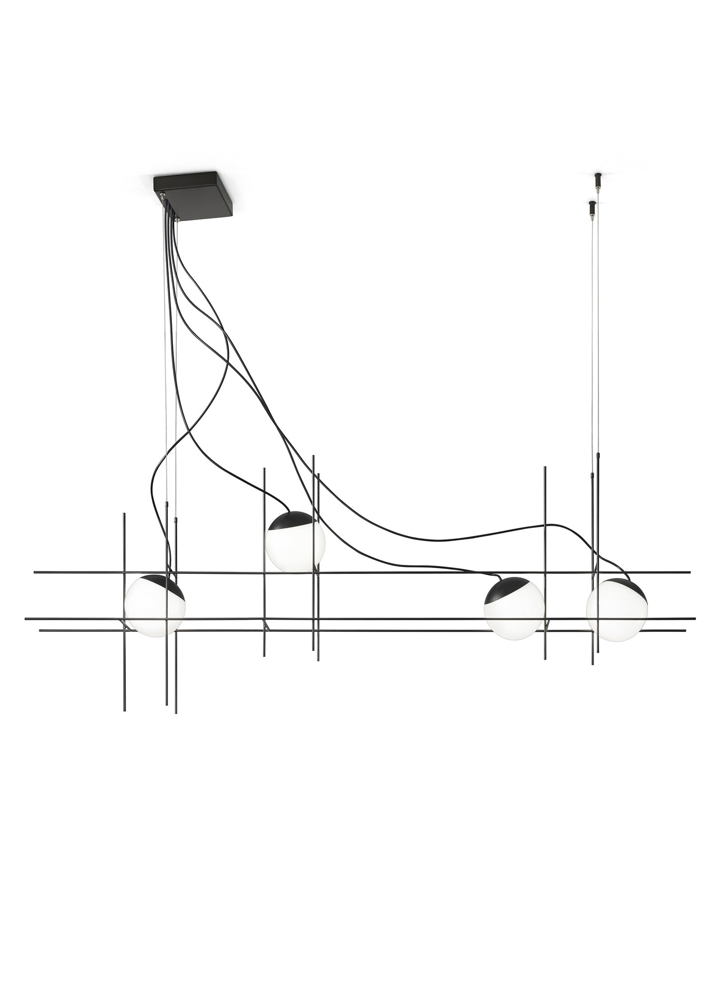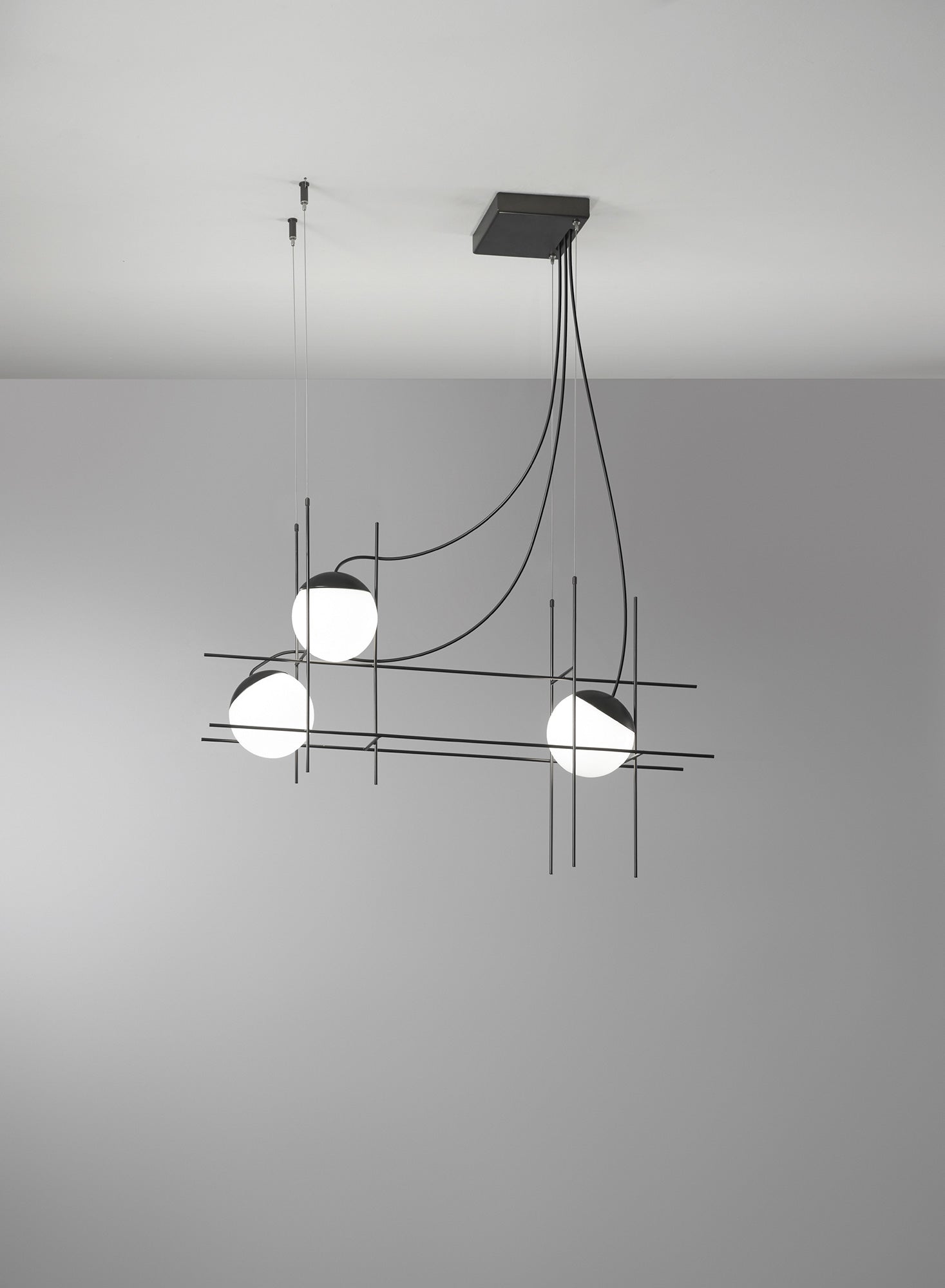 The designing principal of Plot Frame Pendant was to render a sphere of light in suspended motion. Almost hovering luminescent spheres are supported on a metallic weft, creating an exquisite and unique form. The metal cap of the lamp body acts as a heat sink for the in-built LED source and is fixed to the glass by means of a pressure system achieved by the perfect adhesion between the edge of the glass and the cap itself. Available in 3 or 4 light size with matt black metal finish and white blown glass diffusers. Hand made in Italy by Vistosi.