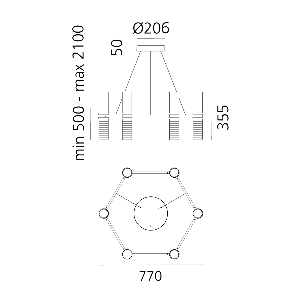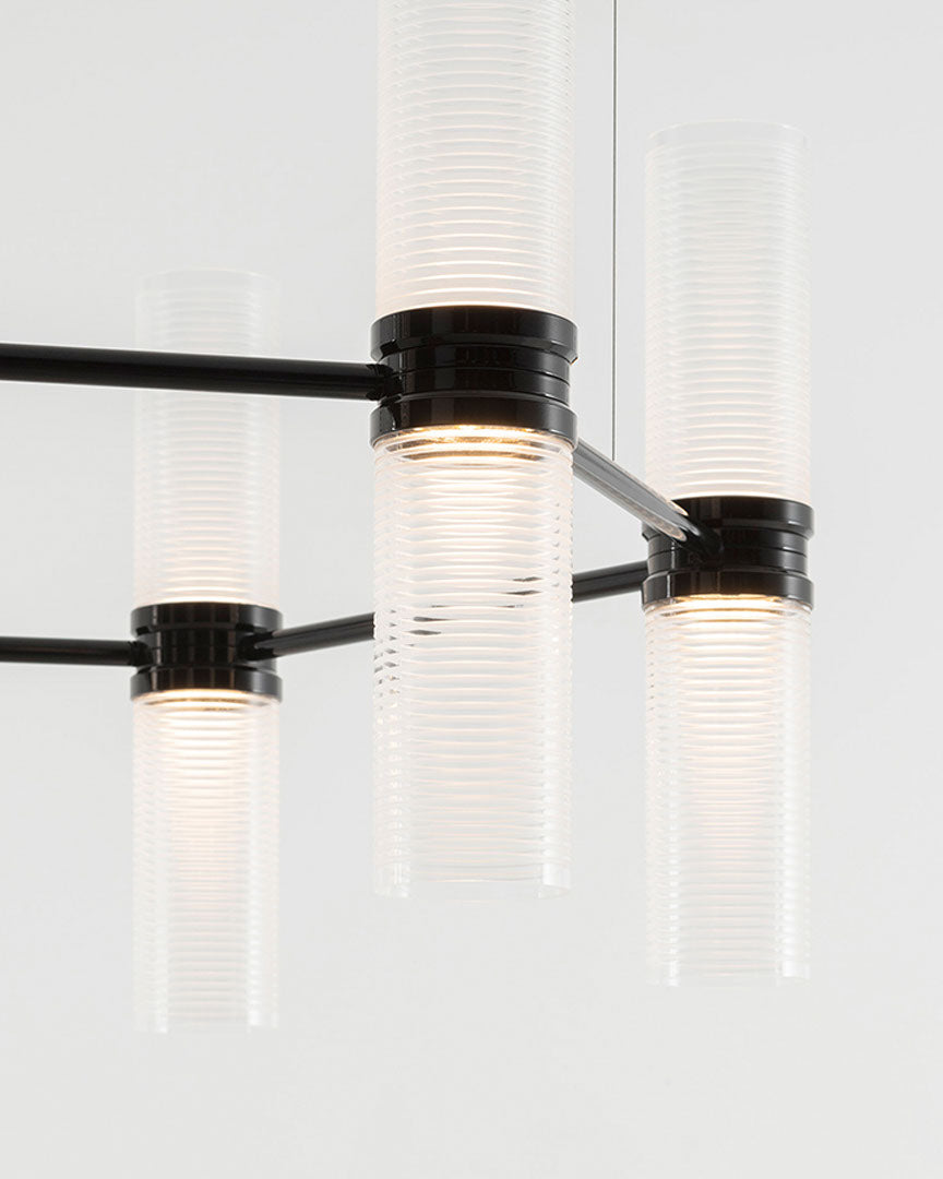 The Artemide Zephyr is a minimalist and elegant pendant that reinterprets the traditional chandelier with contemporary sophistication. Designed by Carlo Colombo, Zephyr features a modular frame system that enables infinite custom layouts to suit the specific needs of each project. The distinctive modular element comprises a double cylindrical diffuser with a central body that encloses the integrated LED light sources. Through two innovative rings that rotate on the same axis, the system defines the position of neighbouring lighting bodies by precisely positioning the connecting structural elements. The hand-blown glass diffuser creates a horizontal texture for glare-free diffusion. This hexagonal suspension features 55W of power delivering 4093lm of warm 3000K light. Available in black or bronze finish with PUSH/DALI or APP controlled dimming. Made in Italy.