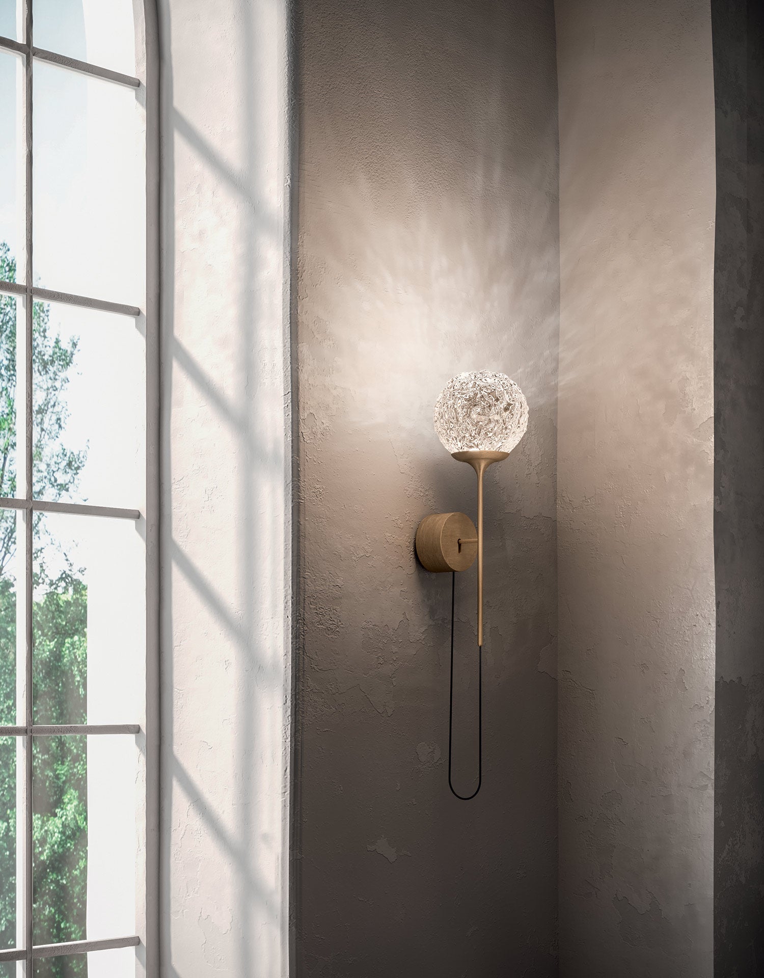 Cristalglob is defined by it's distinct mouth-blown glass diffuser which casts delicate patterns within a space. The wall light version features an adjustable angle. Available with crystal or pink glass with white or brass frame.