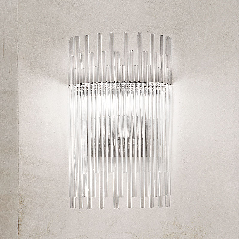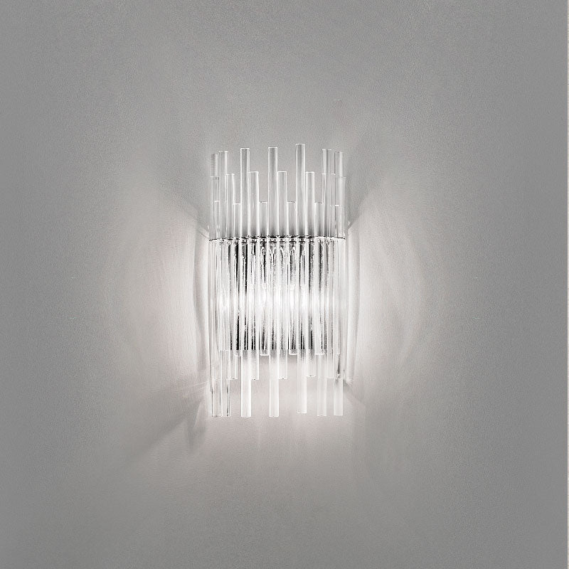 The Diadema Wall light is composed of a network of hand crafted Murano glass rods clipped to a central metal base. The pure glass rods diffuse and refract the light, creating an elegant ambience. Crystal finish and available in two sizes. Design by Romani Saccani Architetti Associati for Vistosi. Made in Italy.