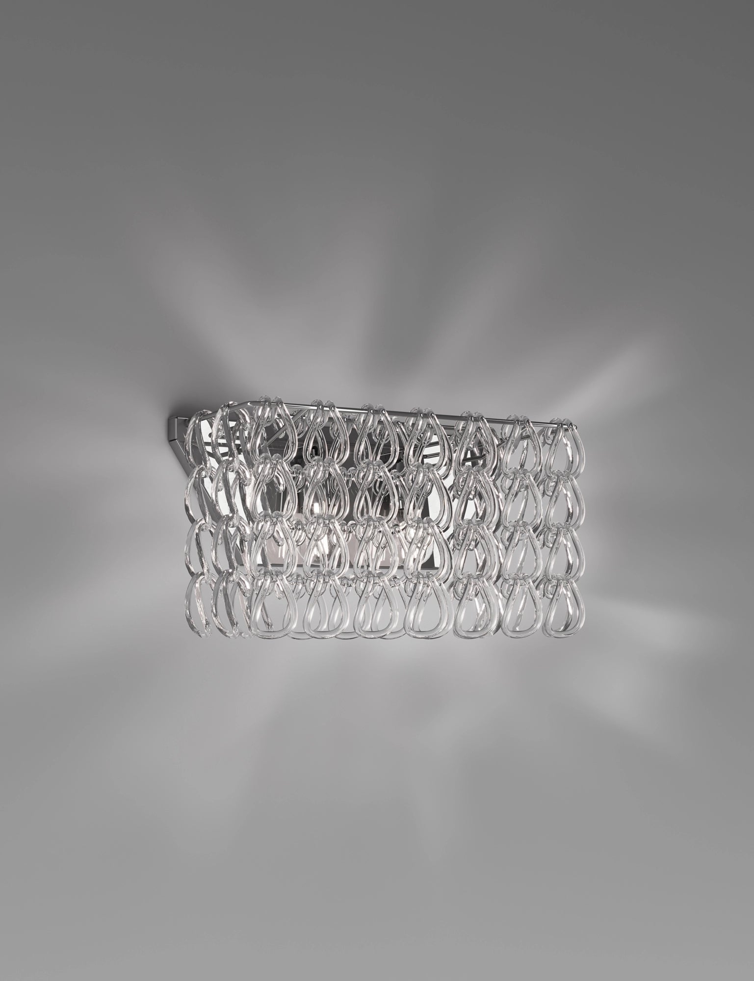The Minigiogali collection from Vistosi expands Angelo Mangiarotti's classic Giogali range through utilising smaller hand made crystal links, providing additional style options. The Minigiogali 2 Wall Light can come with a bronze or chrome frame and a variety of different link colour options. Hand made in Italy.