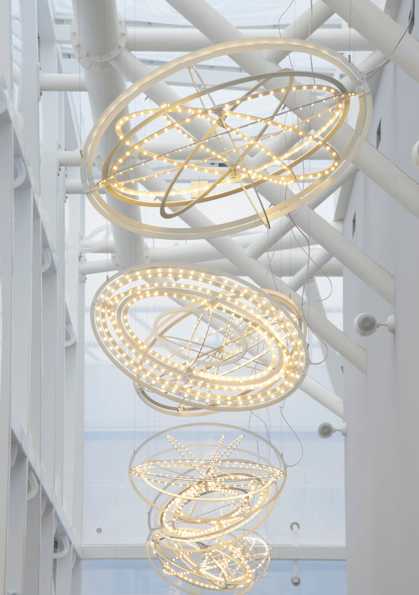 Copernico Suspension is a dynamic pendant light composed of concentric aluminium rings that rotate independently, allowing endless configurations of light and form. Designed by Carlotta de Bevilacqua and Paolo Dell'Elce, it offers both sculptural presence and functional flexibility. When open, Copernico casts a broad, ambient glow; when closed, it becomes a compact, minimalist disc. Lightweight and energy-efficient, it's a striking centrepiece that adapts to its surroundings with elegance and ease.