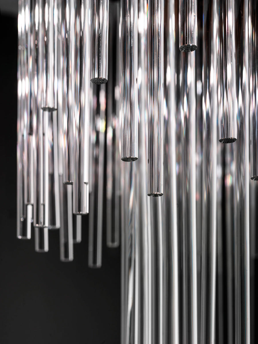 Diadema is based on the single element of the rod in pure glass. Combining reeds of different sizes, the Diadema K3 Chandelier reflects and transmits a feeling of movement, bringing opulence to a space. The metal frame allows numerous variations and plenty of room for customized versions. Design by Romani Saccani Architetti Associati for Vistosi. Made in Italy.