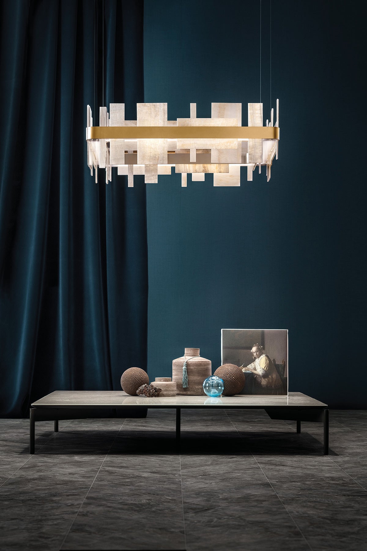 Inspired by the beauty of onyx, the Honice wall light appeals with its high-quality, natural materials and a modern, asymmetrical design. Rectangular natural onyx diffusers of different sizes are vertically and horizontally attached to a frame with curved endings, while the frame itself is made of a band of metal with an opaque gold finish. Light shines upwards and downwards, providing direct and indirect illumination. Its warm tones and precious materials make Honice especially suited to elegant interiors, pairing well with dark wood tones and refined metals. Available in multiple size options. Designed by Oriano Favaretto.