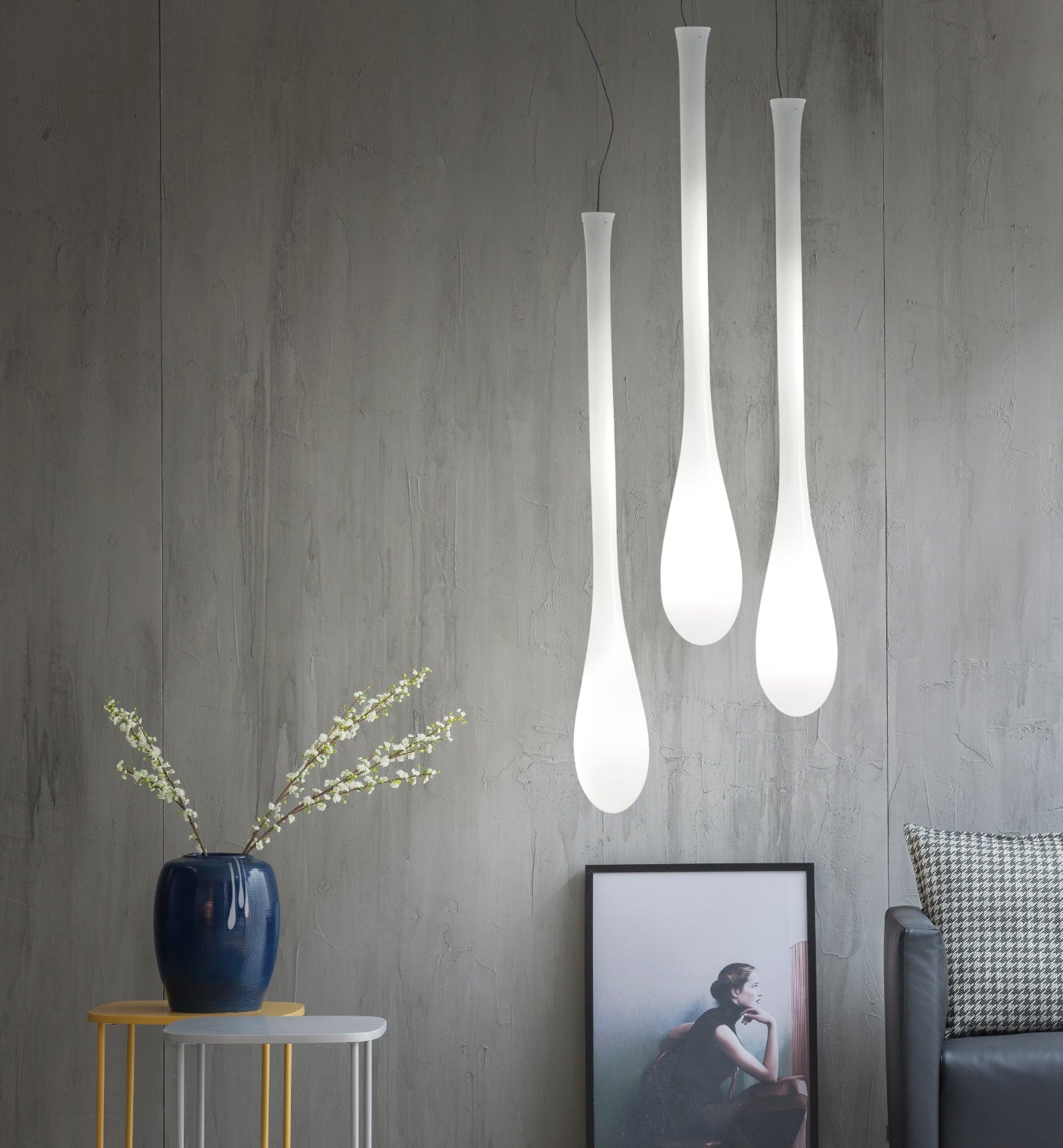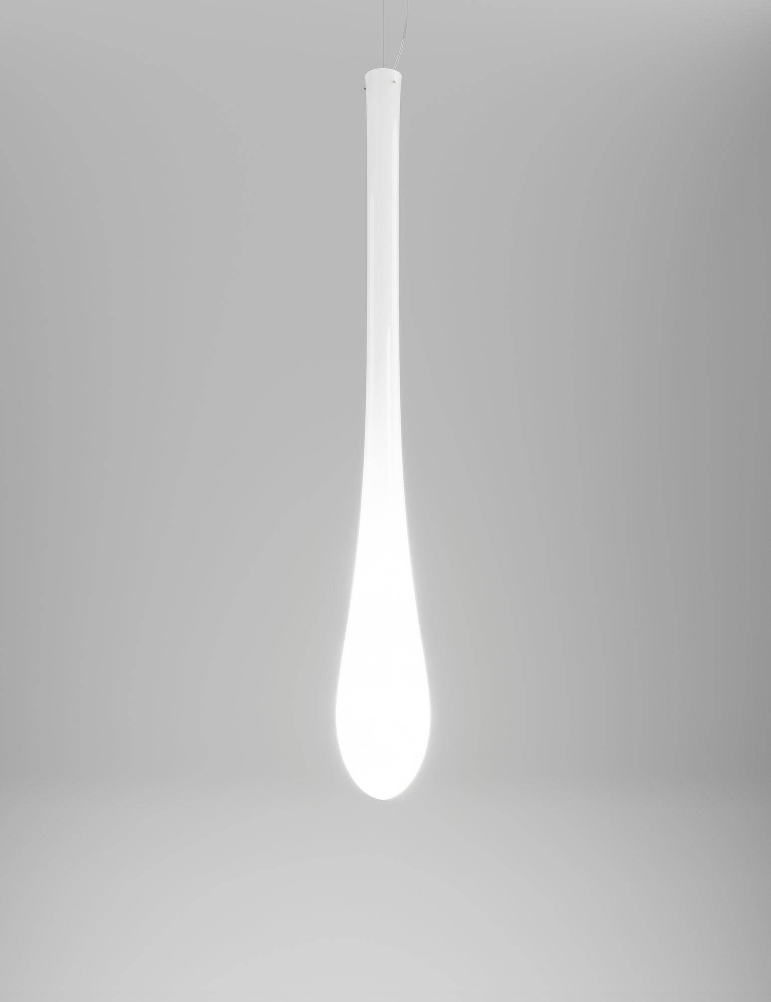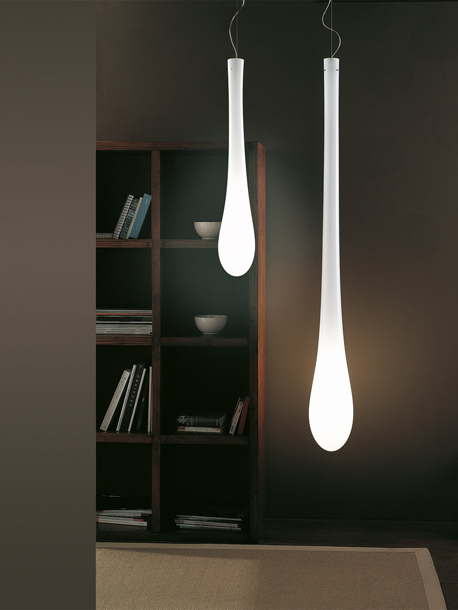 The Lacrima Pendant features a white elongated tear drop design that makes it perfect for staircases, voids and high ceilings amongst other applications. Lacrima is available in two sizes. Hand made in Italy by Vistosi.