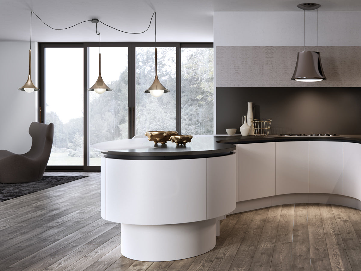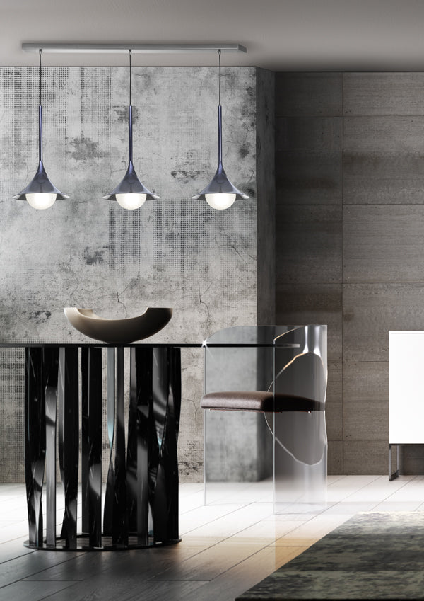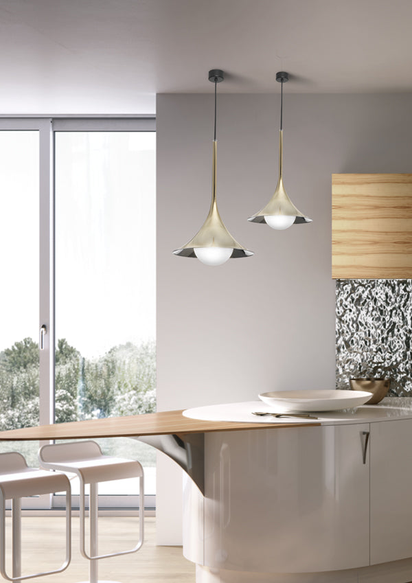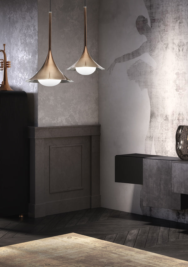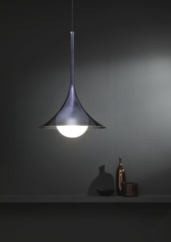 Lady Louis is a 3-dimensional trumpet shaped suspension lamp available in a variety of finishes. A spherical opal glass lamp floats from the mouth of the trumpet-like piece, softly diffusing light. Valaida Snow was one of the great trumpet players and singers of the thirties. Born on June 2, 1905 in the city of Chattanooga, Tennessee, she became known as "Queen of the Trumpet", "The Female Louis Armstrong", "Little Louis" and "Lady Louis". An exceptional player and performer, Snow is remembered as a Jazz pioneer. This lamp is a tribute to Valaida's work and career. Designed by Alberto Manzoni for masters of glass Cangini & Tucci.