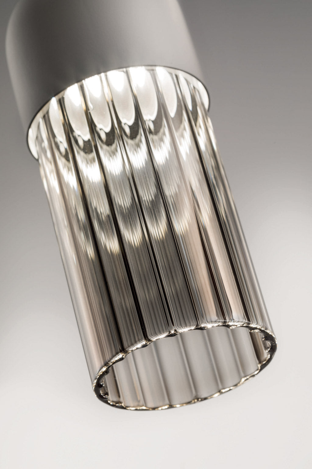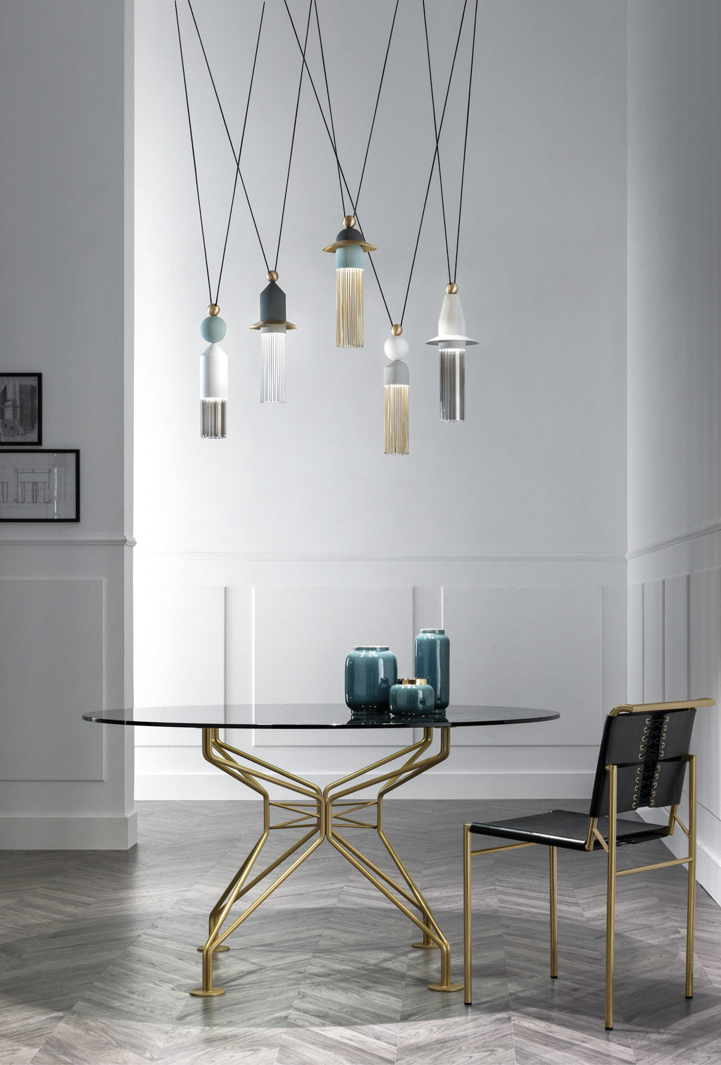 Made in Italy, the Nappe pendant collection is inspired by the 'nappine' (tassels) typically used to close curtains and decorate Venetian salons. Each Nappe is comprised of a painted metal frame with metal or Pyrex rods and Pyrex diffusors with an inbuilt LED source. The Nappe chandelier is ideal for feature lighting applications in dining and living areas. Available in several configurations.