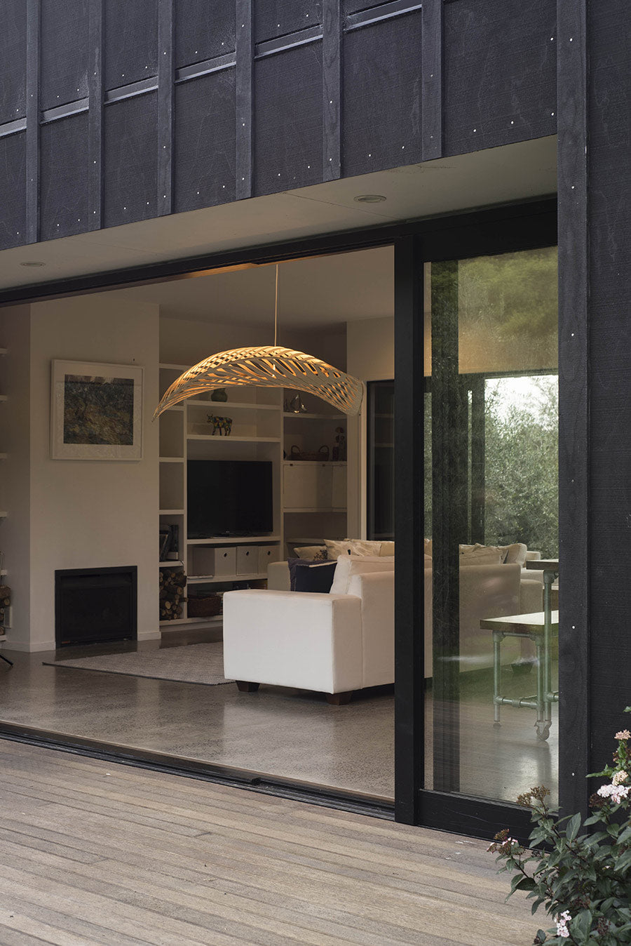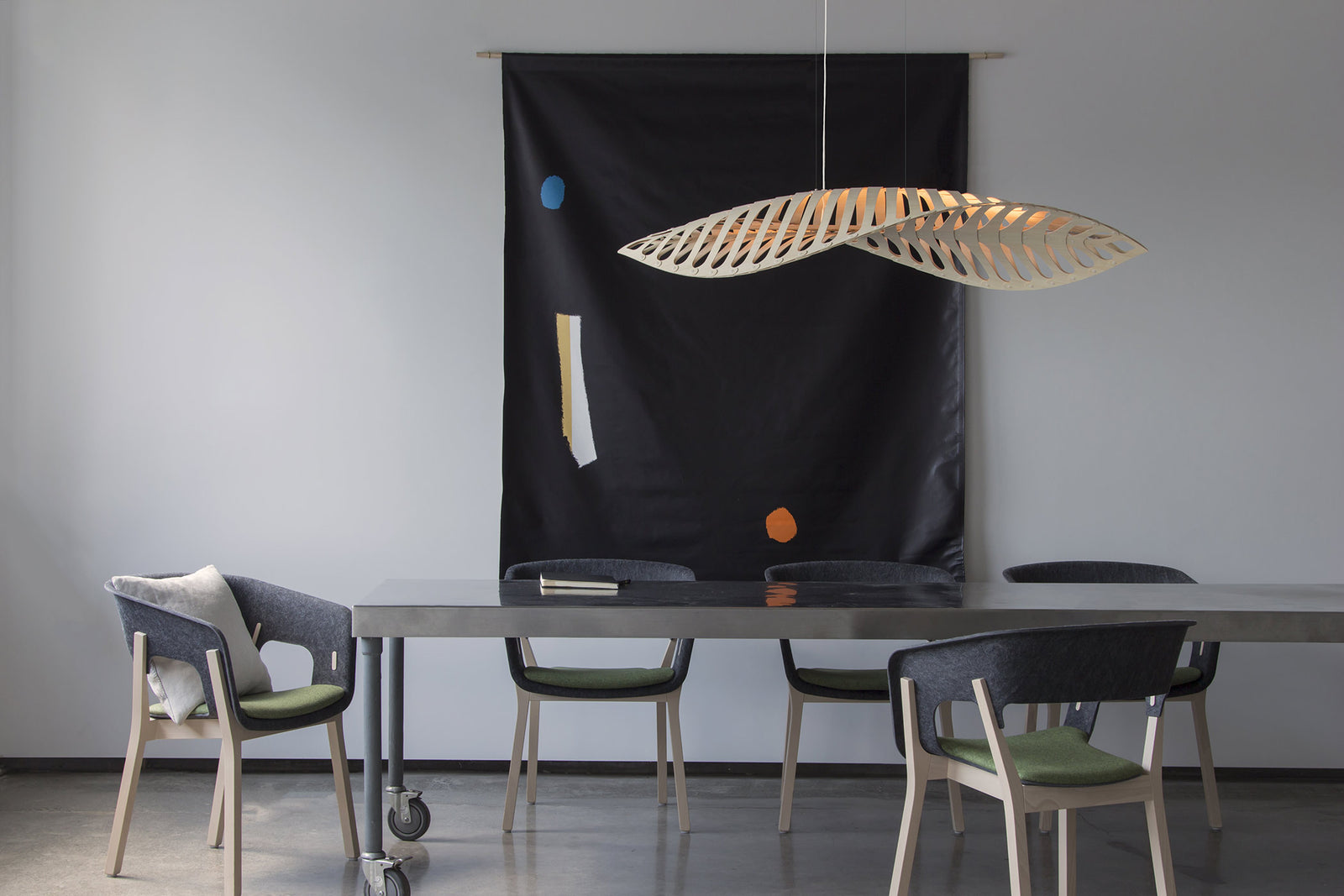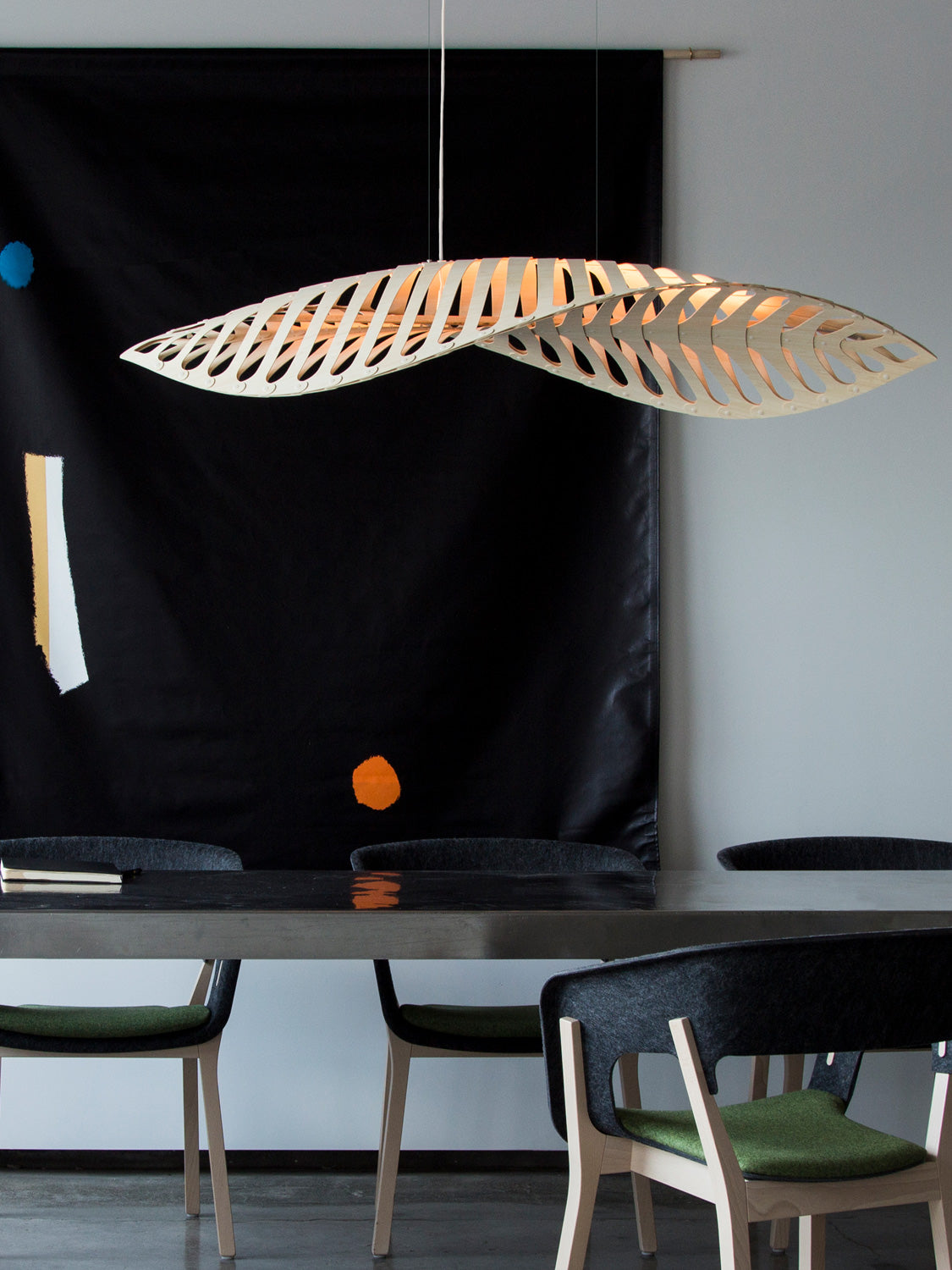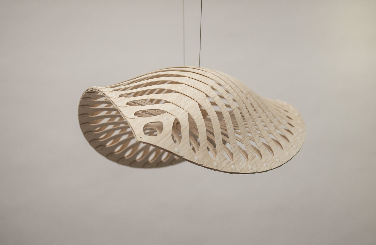 Navicula is derived from nature, in this case from one of the many microscopic diatoms that float around in the oceans. The flowing, segmented form is shipped as kitset and assembled on site with push-in nylon clips. The thin curved pieces of CNC-cut bamboo plywood create a flowing structure that also casts magical patterns. It is lit from within with a row of LED pin-point lights. Available in three sizes and a wide variety of finish options.