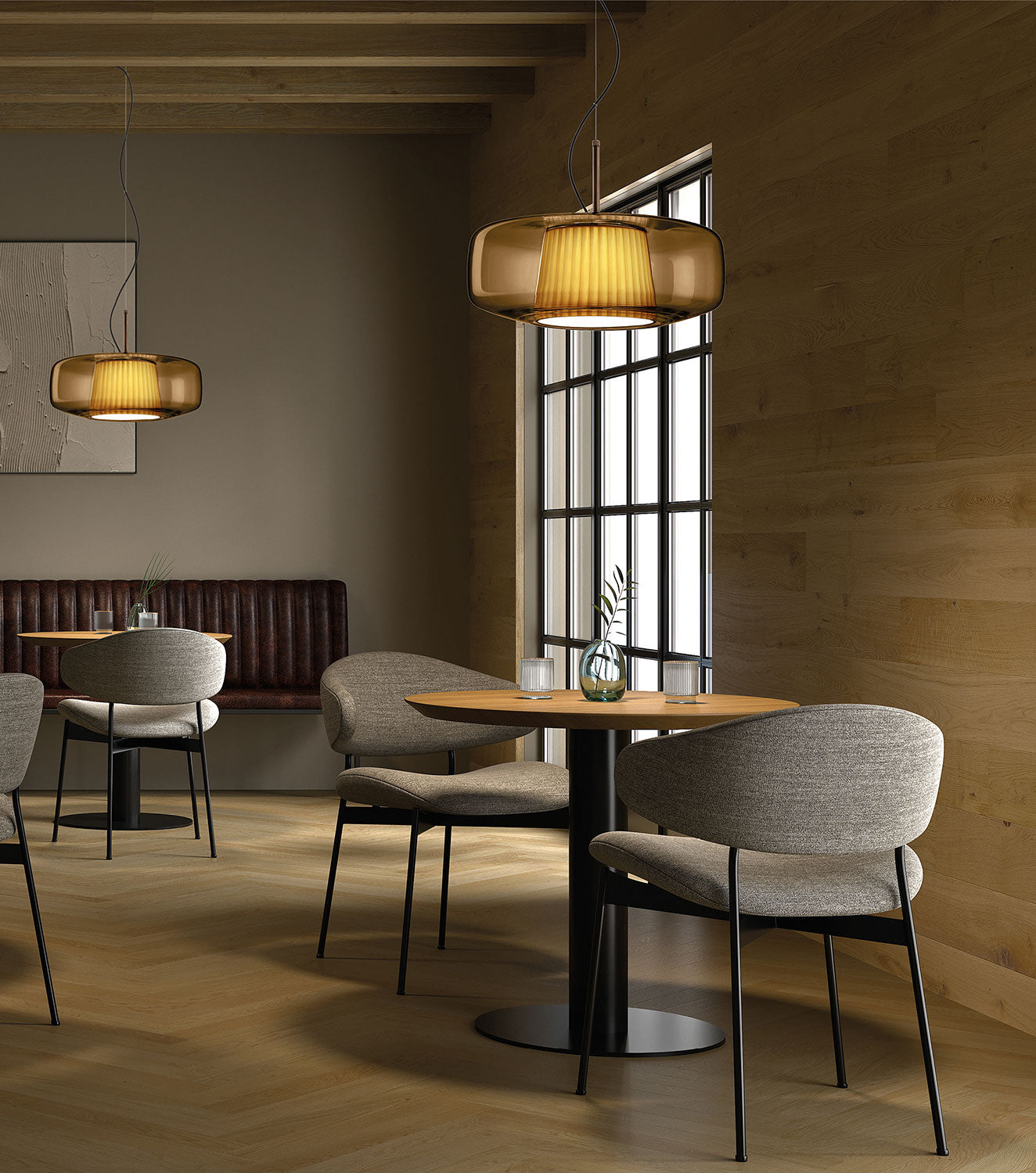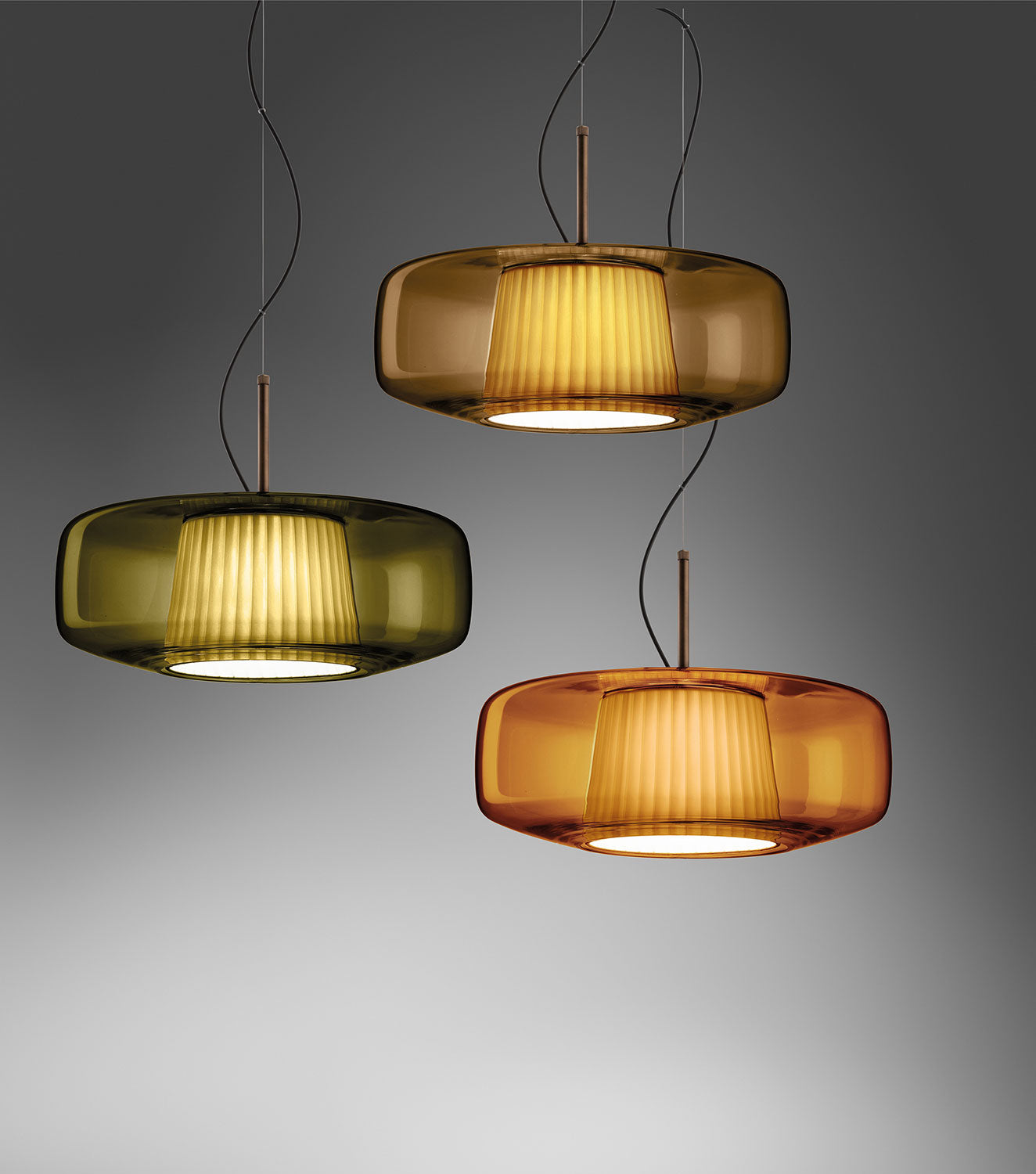Plisse, a pendant lamp with an LED source, exhibits a sophisticated design reminiscent of the graceful movement of jellyfish. The oversized blown glass diffuser encapsulates an inner fabric lampshade, creating a play of transparencies, shades, and textures. Its elegant silhouette and the meticulous interplay of materials make Plisse a distinctive and refined addition to any space it graces. Available in various finish combinations.