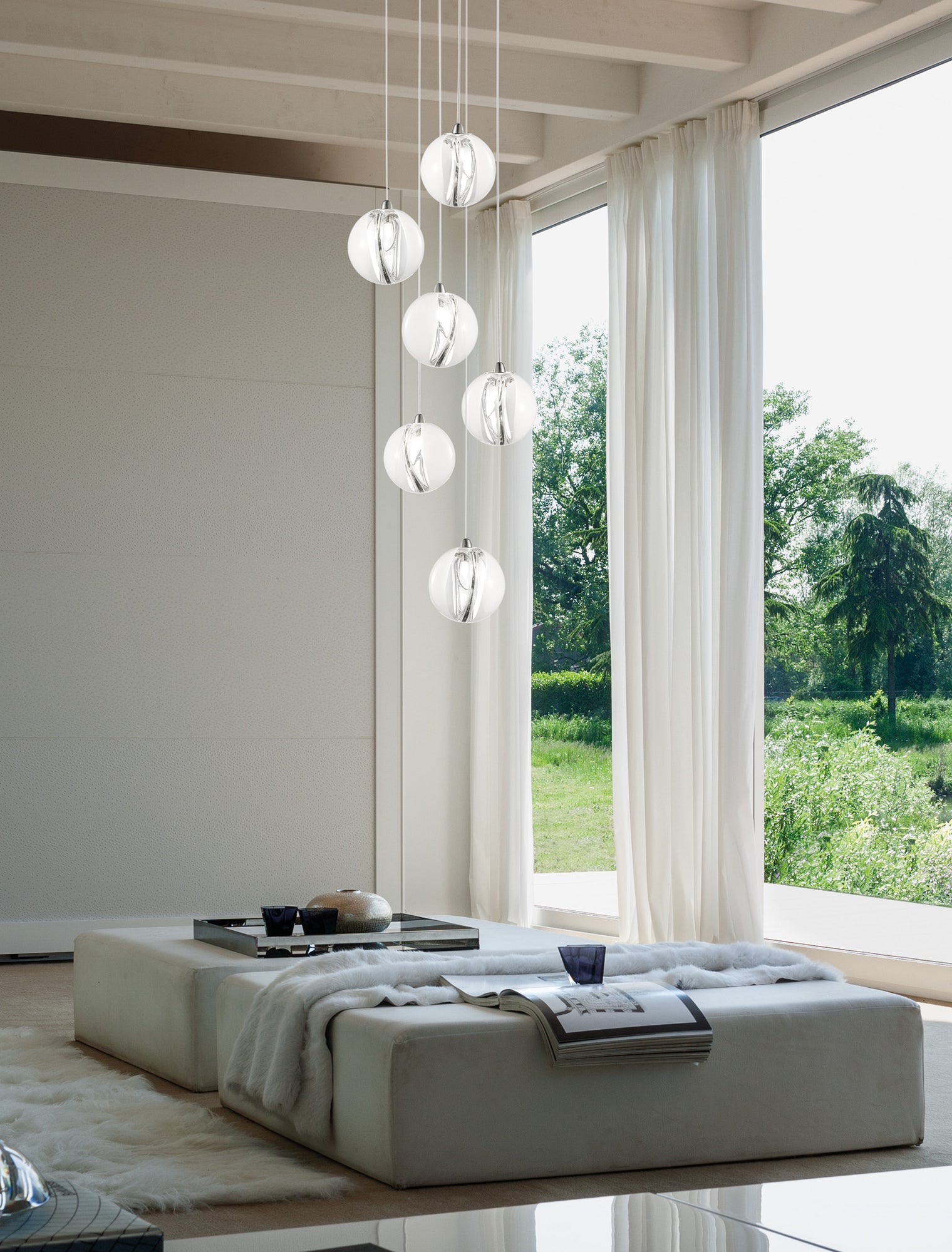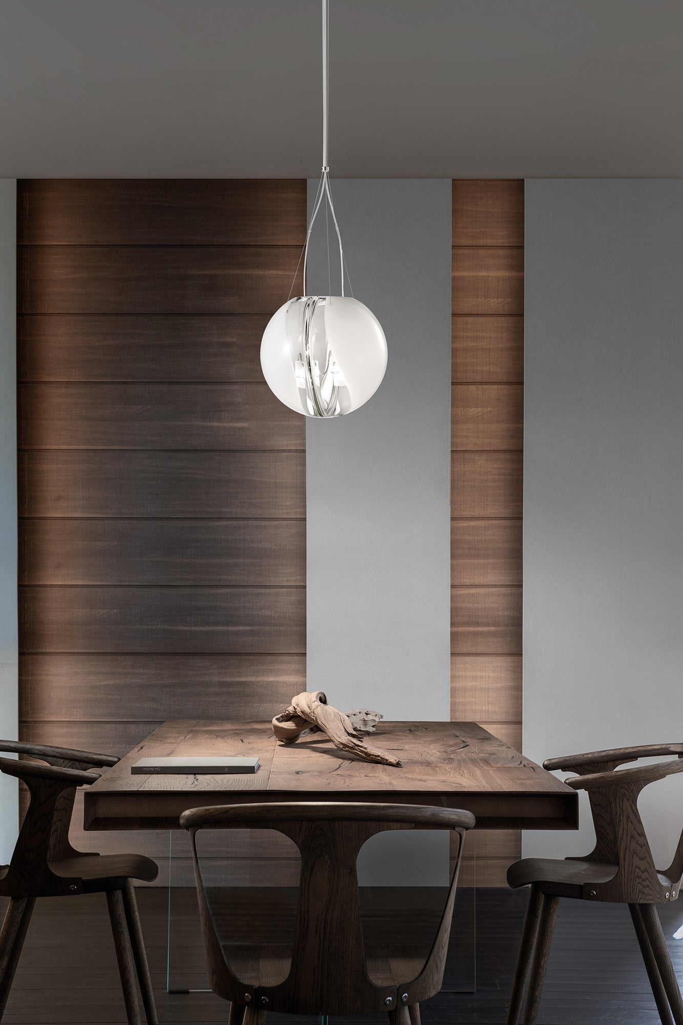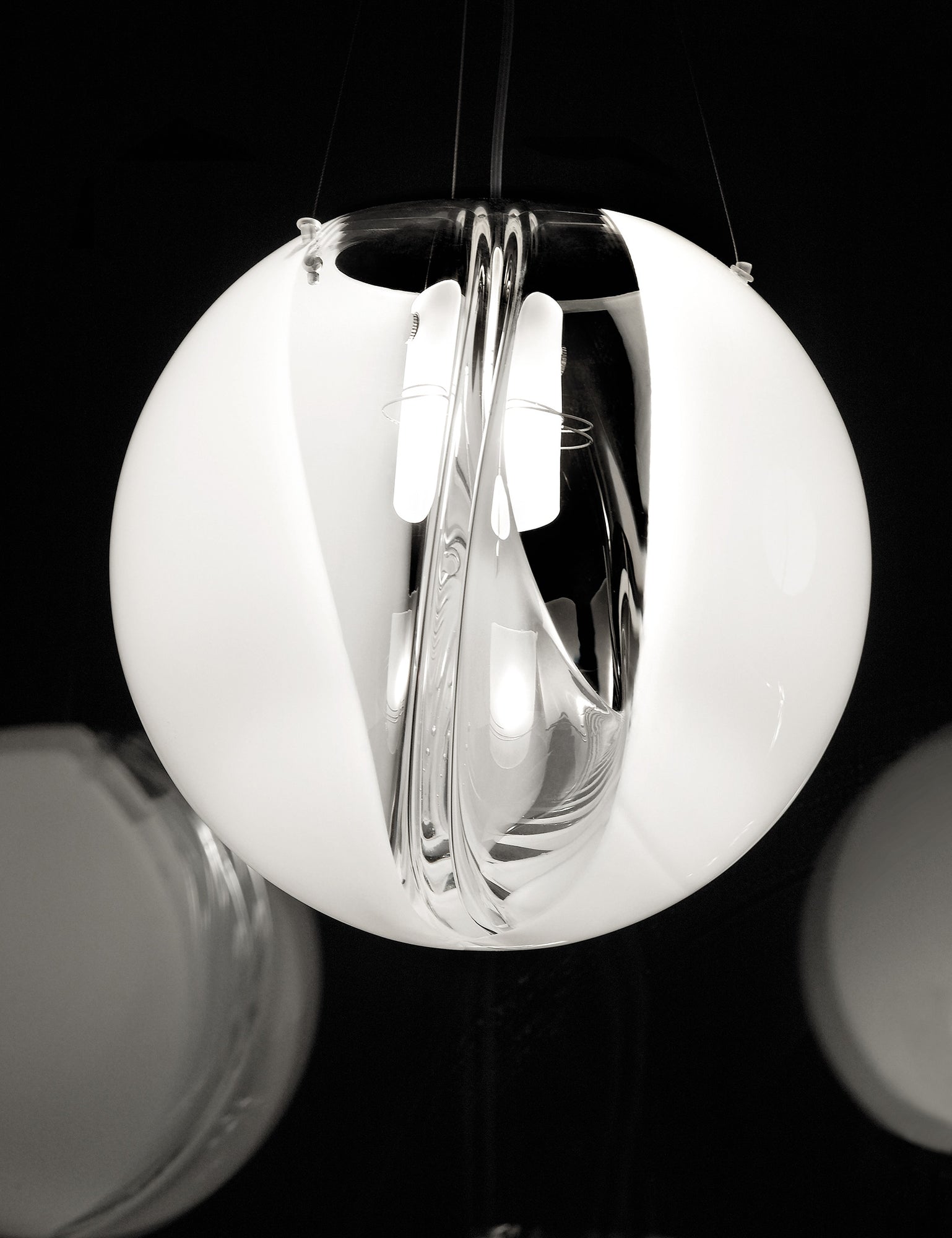 The Poc is a uniquely made hand-blown Murano glass Pendant. The spherical glass presents an internal membrane that acts as a lens to create the illusion of being made in two halves and adds a sense of dynamic change of intensity and colour at the surface that allows for the uniqueness of each piece. Available in two sizes in white finish.