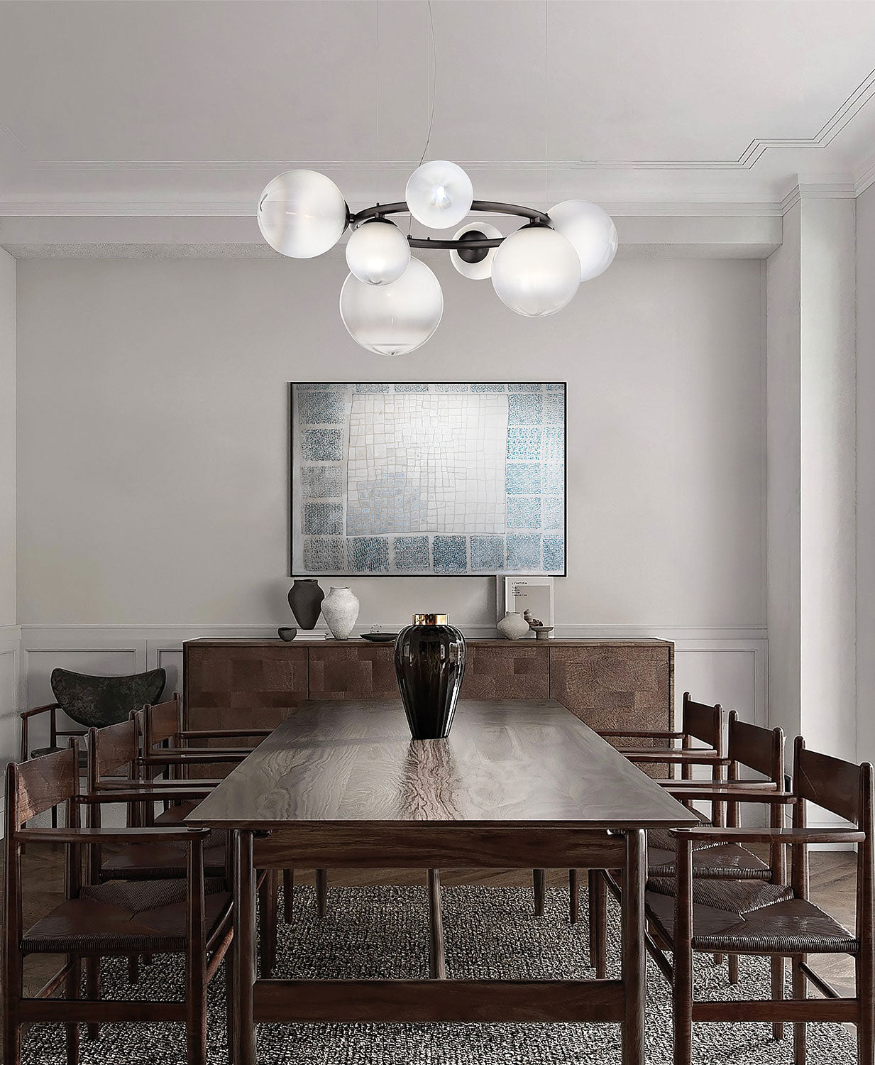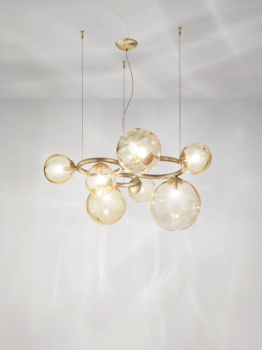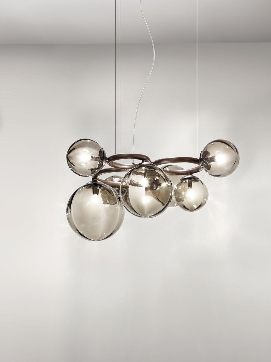 A re-imagining of the now modern classic Puppet collection, Puppet Ring is a new innovation from Romani Saccani Achitetti Associati. As with the original, Puppet ring incorporates delicate mouth blown crystal diffusers, each imbued with an irregular lined degrade finish which produces a soft cloudy pattern on surrounding surfaces. Puppet ring differs from past designs through it's unique "ring" like frame, imbuing the updated collection with an air of contemporary elegance. Available as 5, 7, or 9 light configuration in a variety of finish option and combinations.