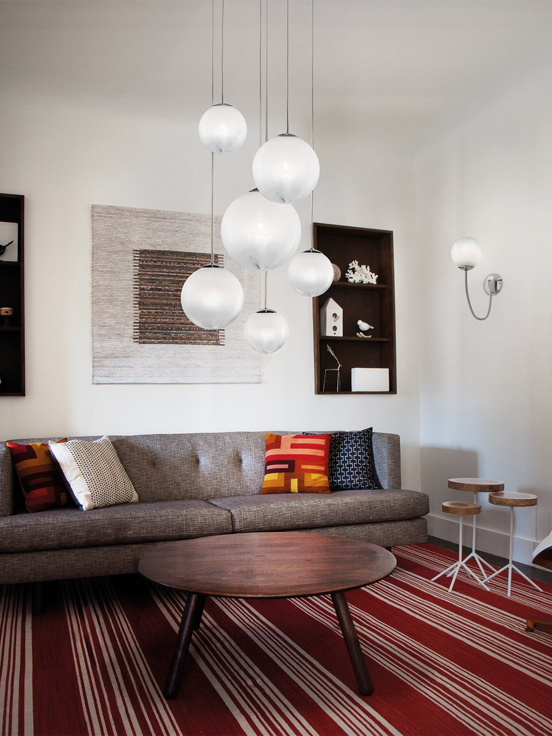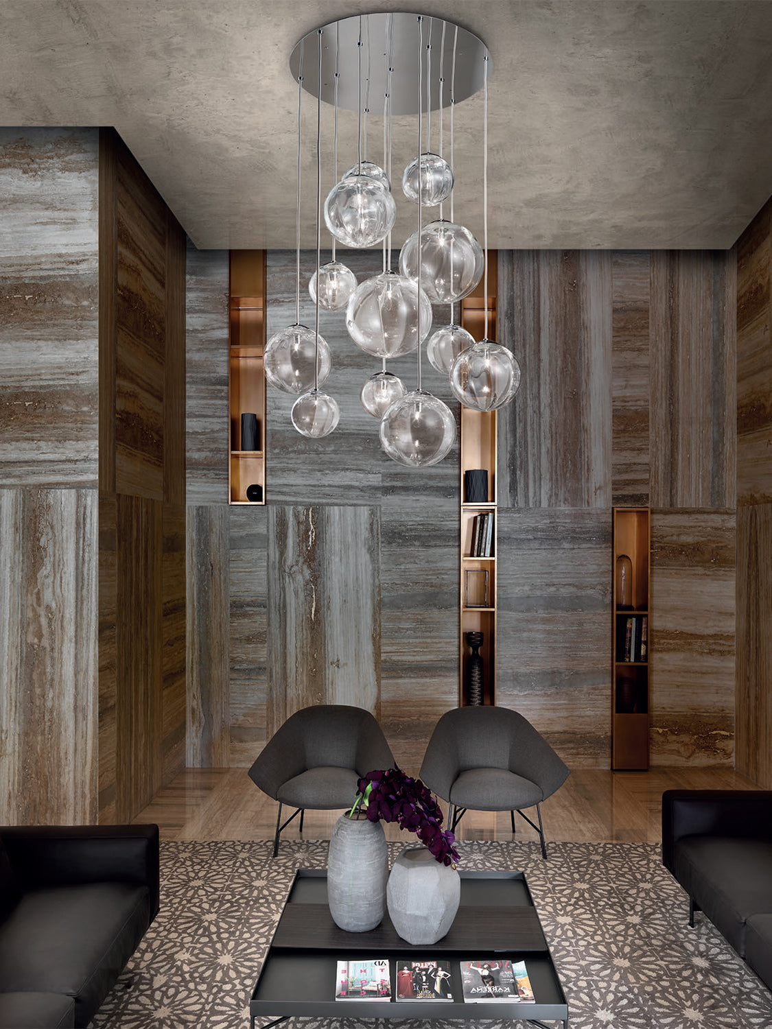 Contemporary lighting system featuring up to 24 hanging mouth blown crystal pendants, suspended from a round mounting plate affixed to the ceiling. Every version of the PUPPET ROUND utilizes a combination of small, medium, and large sphere pendants to create an elegant composition. Each glass diffuser features an irregular lined degrade finish, producing a soft cloudy pattern on surrounding surfaces. Available in various sizes and colour options.