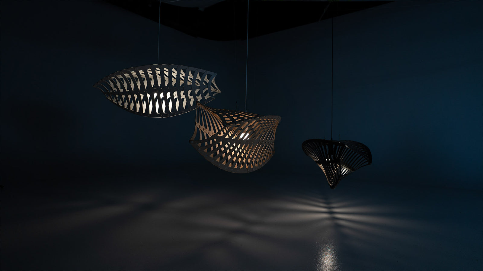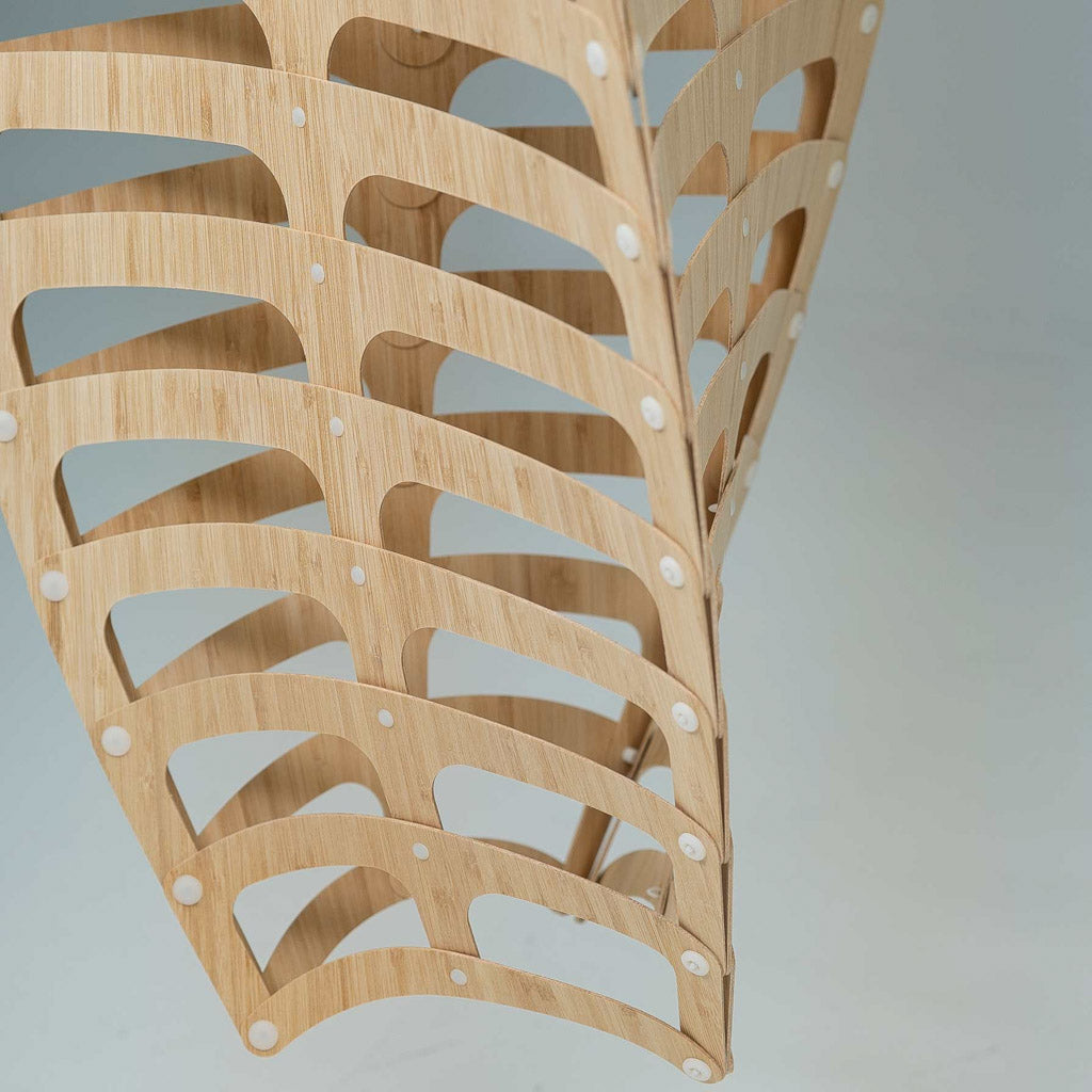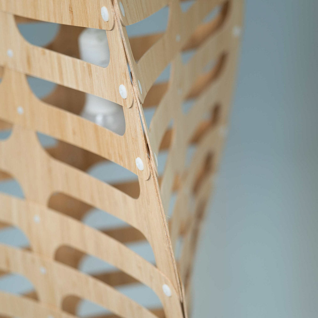 Based on the award-winning Navicula feature light, Toru is crafted from strong, multi-layered bamboo plywood creating a natural skeletal skin. The light's unique three-sided shape is the third pendant light inspired by microscopic diatoms and is named after the Te Reo Maori word for "three". The light adds an element of sculptural nature as it can be installed either horizontally or vertically. Toru's three sides create a mesmerizing twist that interplays light and shadow, providing a warm and welcoming glow that's perfect for dining tables, lounges, foyer, reception or as a corner statement piece. Sustainably made in New Zealand and available in a variety of sizes and finish options.