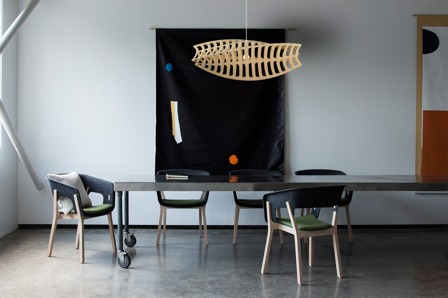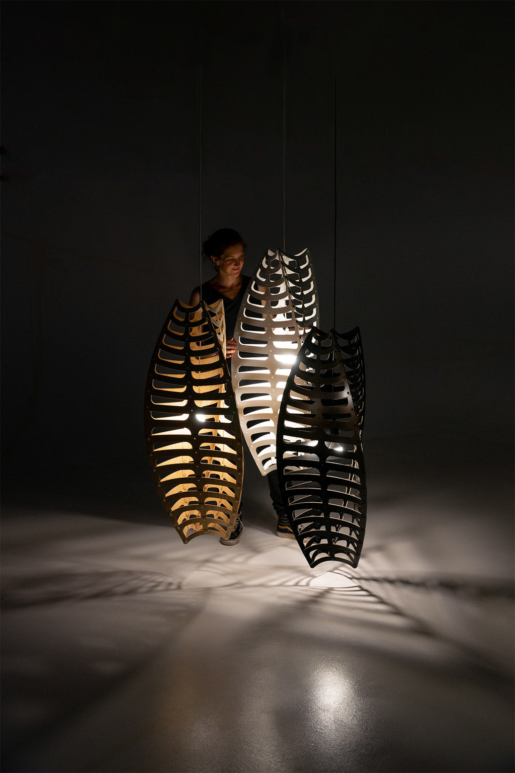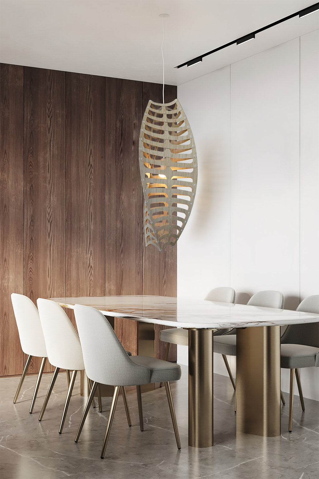 Based on the award-winning Navicula feature light, Toru is crafted from strong, multi-layered bamboo plywood creating a natural skeletal skin. The light's unique three-sided shape is the third pendant light inspired by microscopic diatoms and is named after the Te Reo Maori word for "three". The light adds an element of sculptural nature as it can be installed either horizontally or vertically. Toru's three sides create a mesmerizing twist that interplays light and shadow, providing a warm and welcoming glow that's perfect for dining tables, lounges, foyer, reception or as a corner statement piece. Sustainably made in New Zealand and available in a variety of sizes and finish options.