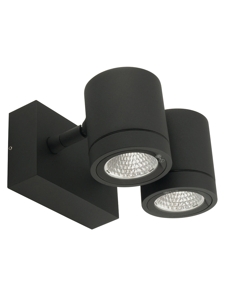 Myra is a surface mounted wall spot light for outdoor applications. Aluminium construction with two spot adjustable spot heads affixed to base. Each spot equipped with built in 8W LED source (960lm, 3000k, CRI 80) with 35 degree reflectors. Dimmable. Myra has an ingress protection of IP55 and an impact protection of IK06 with anti-corrosive coating. Available in anthracite finish. French designed.