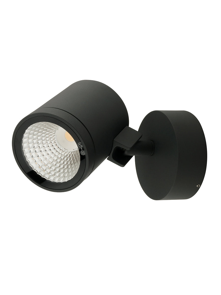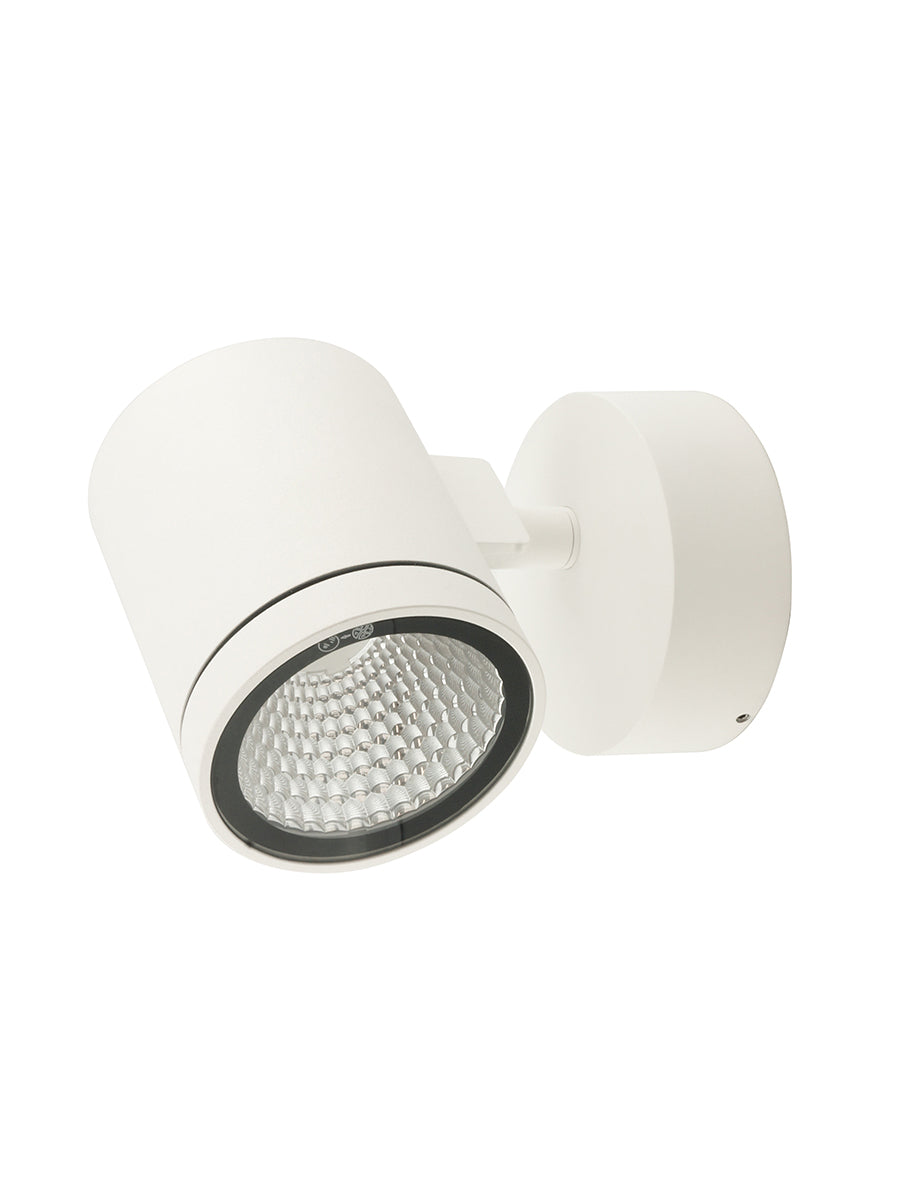 Adjustable outdoor wall spot with 50 degree reflector.Zuky has an ingress protection of IP65 and an impact protection of IK06 for outdoor applications. 10w LED, 3000k, 830lm, CRI 80, dimmable. Available in white or anthracite finish.
