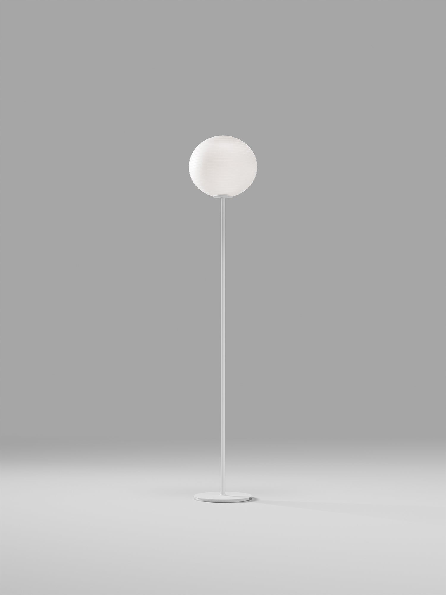 Flow Glass is an elegant floor lamp with a diffused emission. The blown glass diffuser features thin rings in relief that create a geometry similar to that of oriental paper and bamboo lanterns. Designed and manufactured in Italy by Rotaliana. Available in matt white finish.