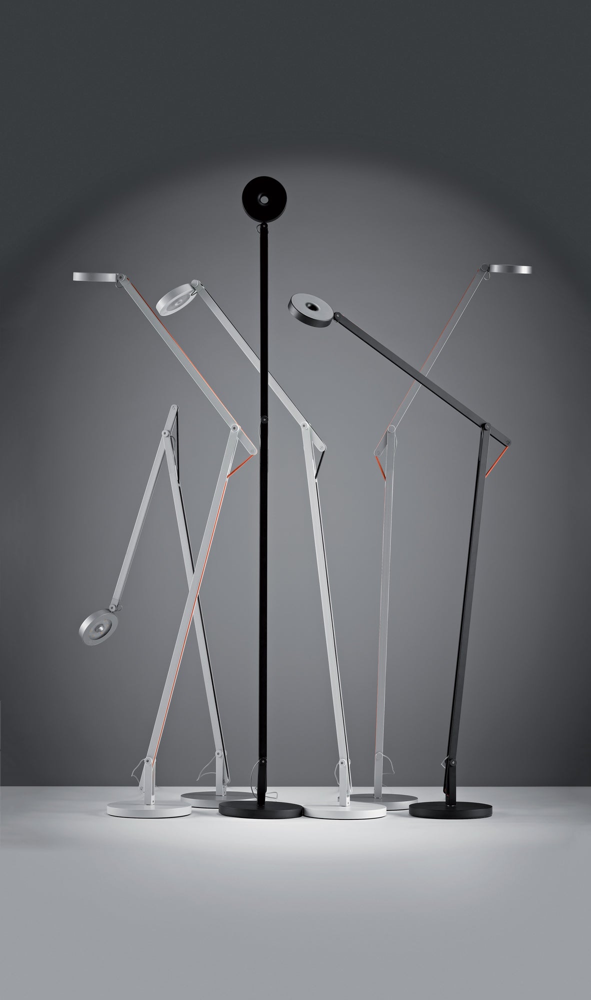 The String Floor Lamp by Rotaliana realises modern design in a highly functional form ideal for task lighting and indirect illumination. The adjustable head, made of moulded plastic, is easy to handle thanks to its ring shape. Two adjustable arms in extruded aluminium are balanced by an elastic cable, sheathed in synthetic-coloured fabric, and by an aluminium and cast-iron ballast base. A touch-sensitive tuneable-white switch within the lamp's head adjusts the LED light's luminosity and colour temperature (2500K to 4000K). Available in various contemporary finishes with three cable colour options. Made in Italy.