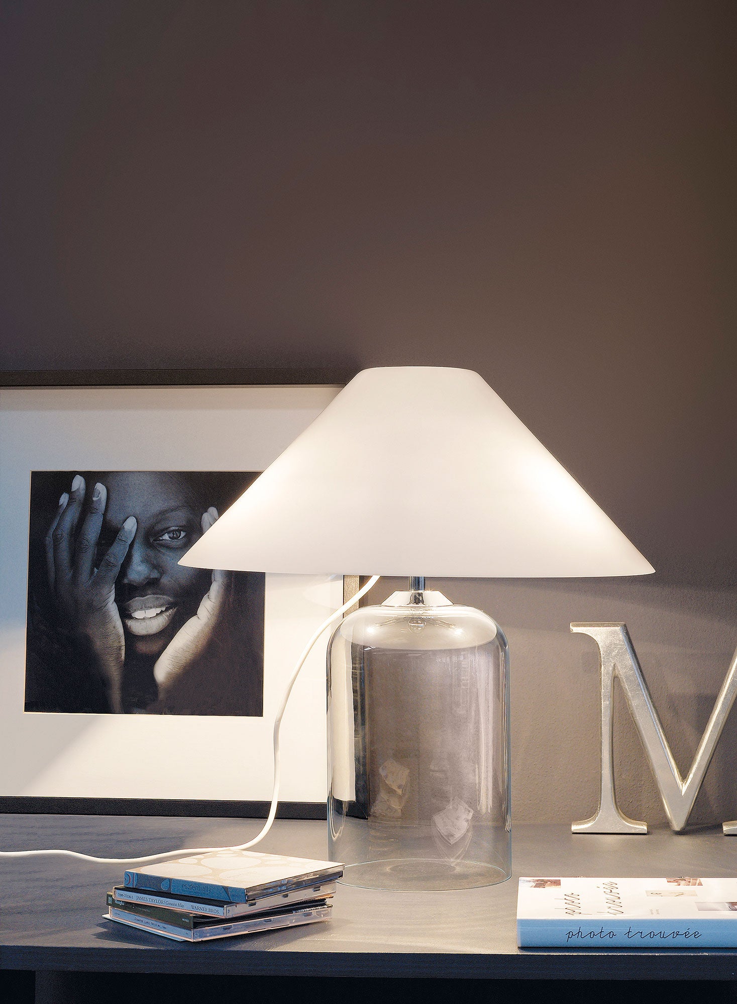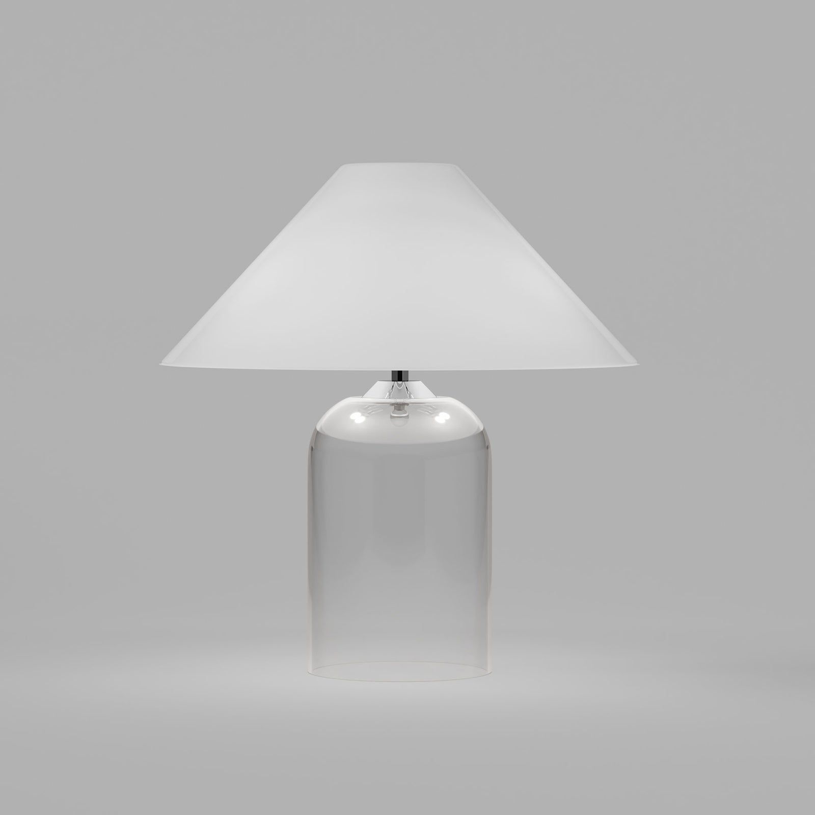 Alega is a mouth-blown Murano glass table lamp with a white glass shade and clear glass base. A design that combines a classical concept with a retro inspiration, the transparent base and white diffuser imbue the light with warmth. Designed by Vico Magistretti.