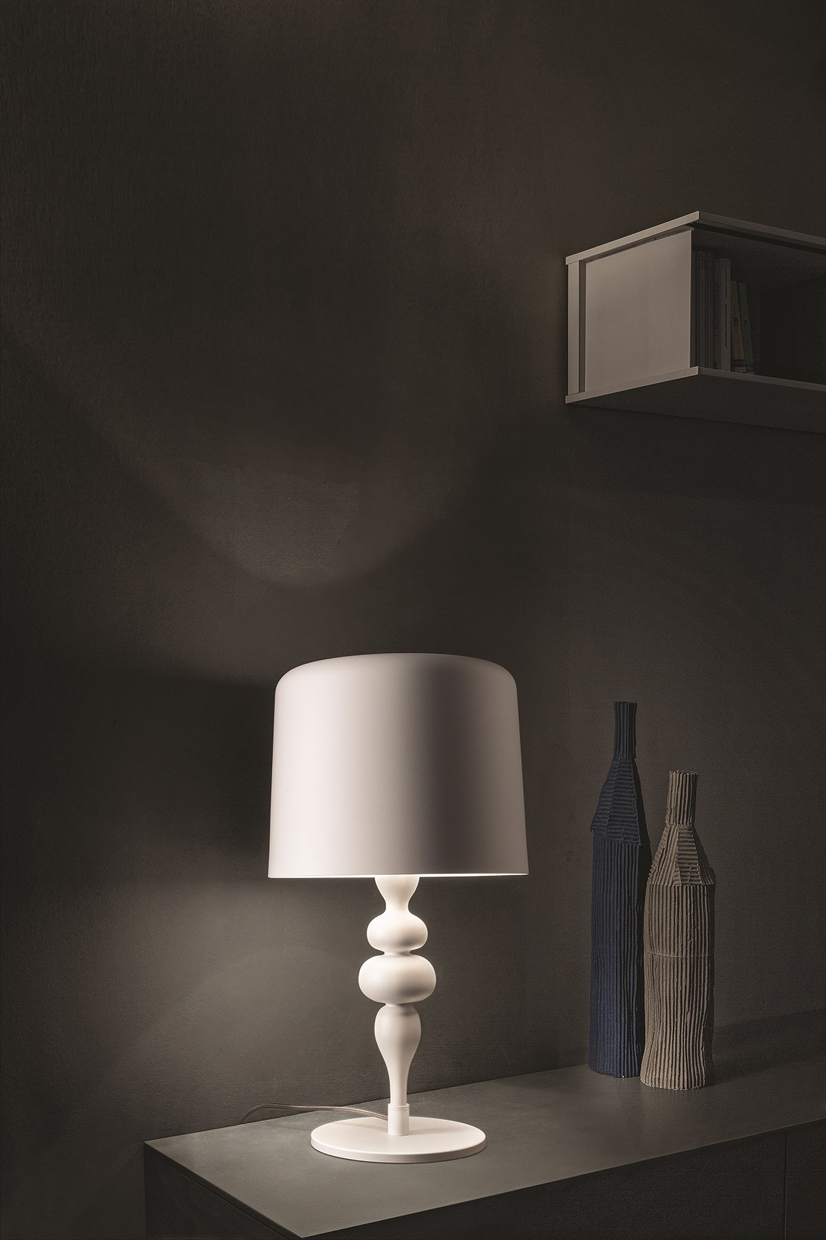 The Eva collection magnificently embodies a modern interpretation of classic chandeliers. Like a blossoming flower, Eva enchants with fluid sinuosity and conveys a sense of calm. The table lamp features a resin and polyurethane frame with an aluminium lampshade, accentuating its modern aesthetic. Available in three sizes and a variety of finish options.