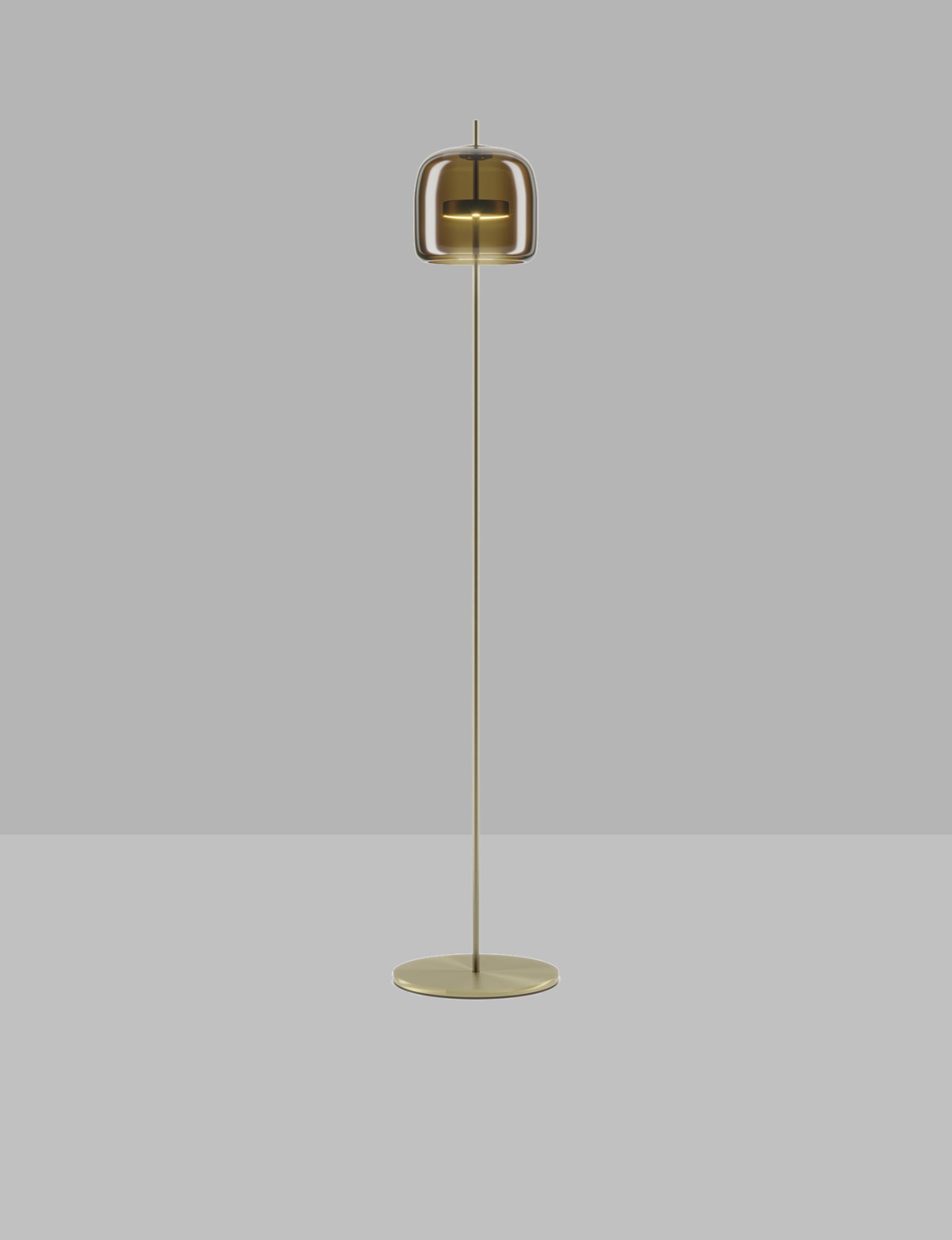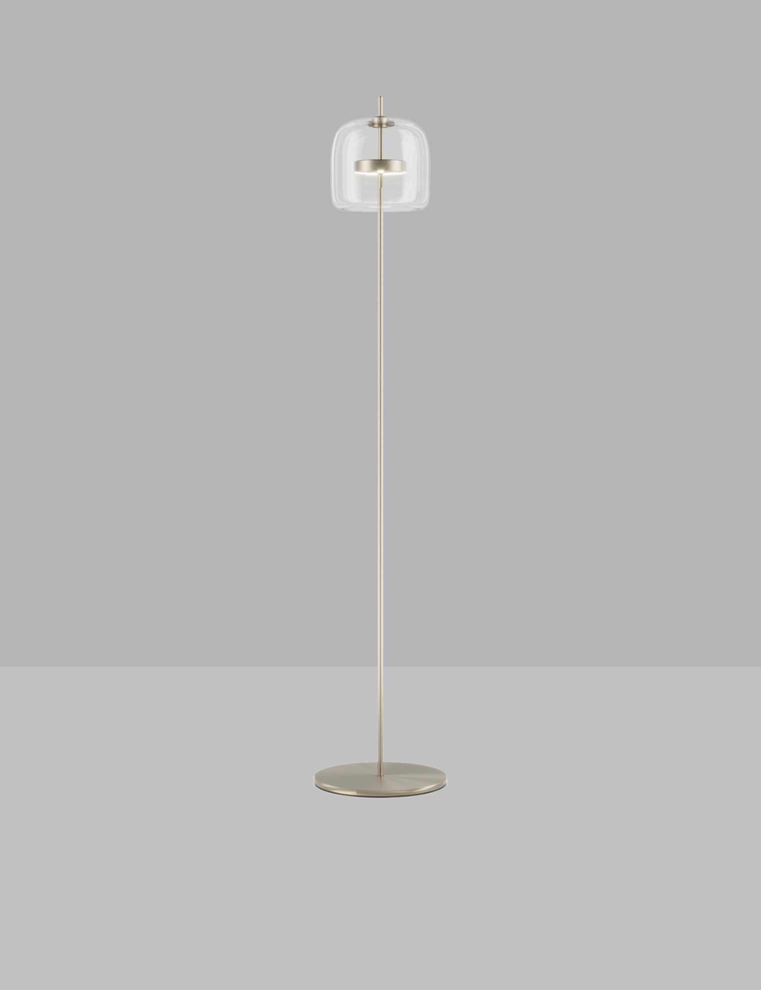 A floor lamp version of the award winning Jube pendant from Vistosi. Jube was born from the union of two mouth blown glasses that, once assembled together, create an overlapping, ton sur ton effect with retro charm. An 13W LED source produces a widespread light in a form ideal for adding delicate accents within a space. Available in various finish combinations.