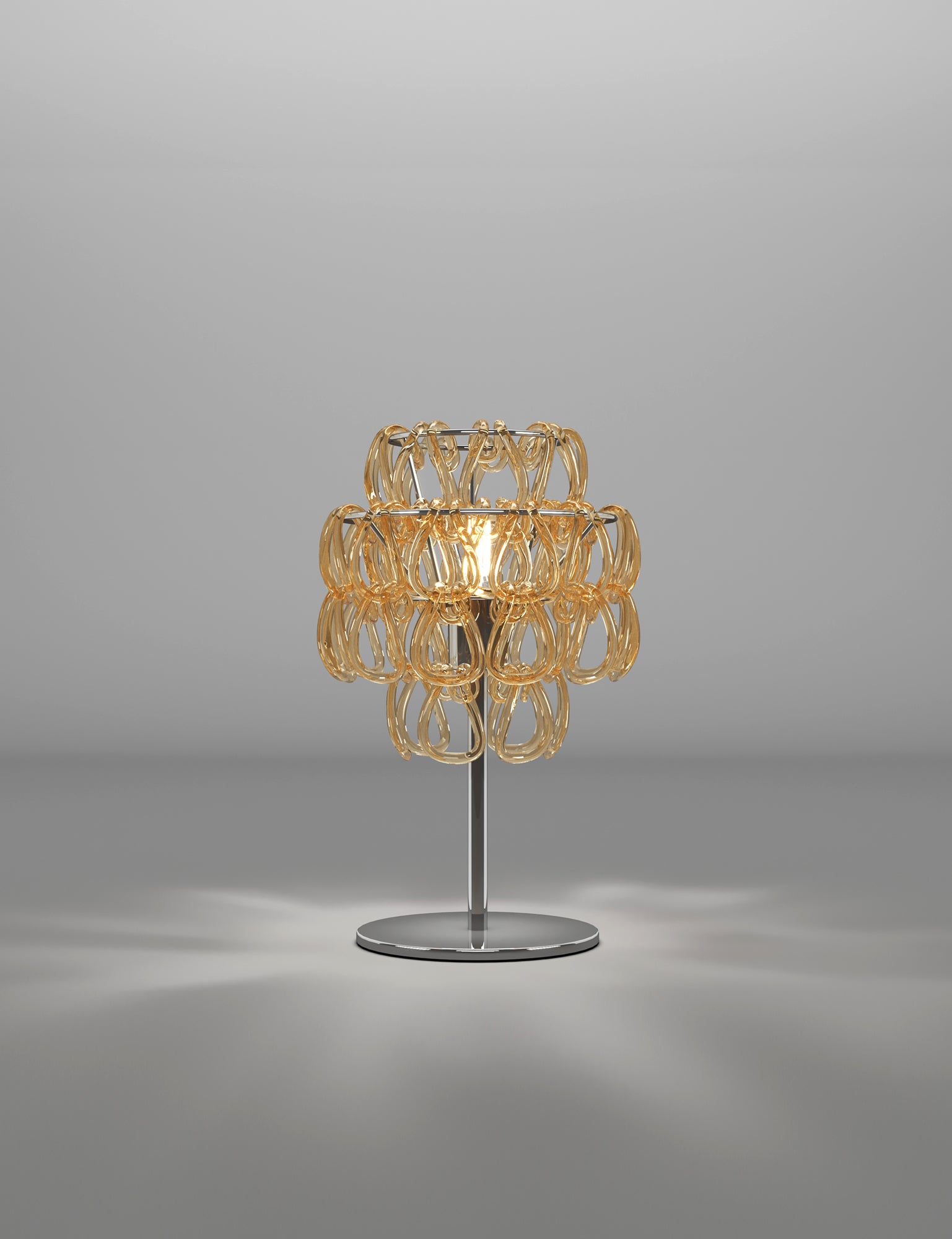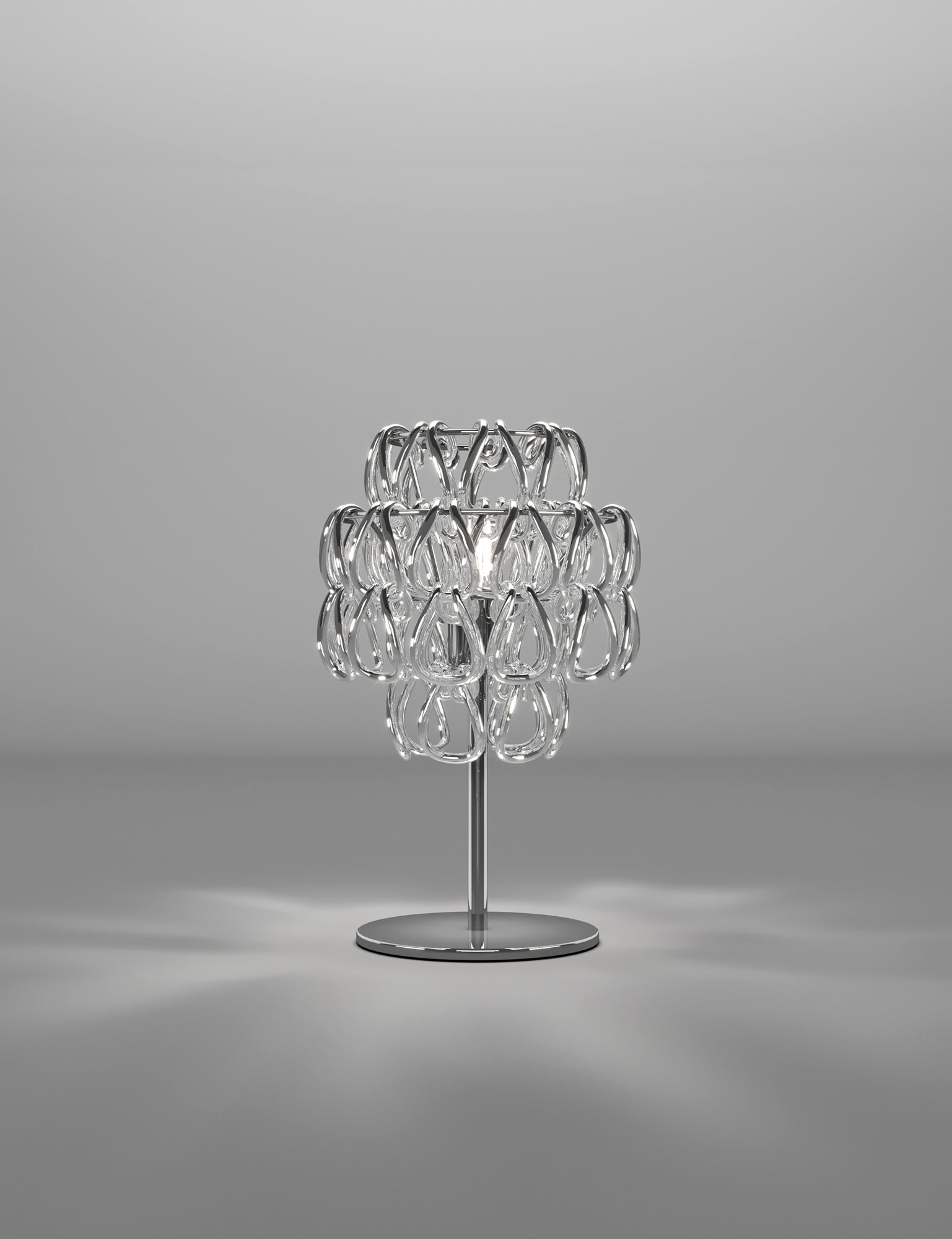 The Minigiogali collection from Vistosi expands Angelo Mangiarotti's classic Giogali range through utilising smaller hand made crystal links, providing additional style options. The Minigiogali Table Lamp comes in bronze or chrome frame with a variety of different link colour options. Hand made in Italy.