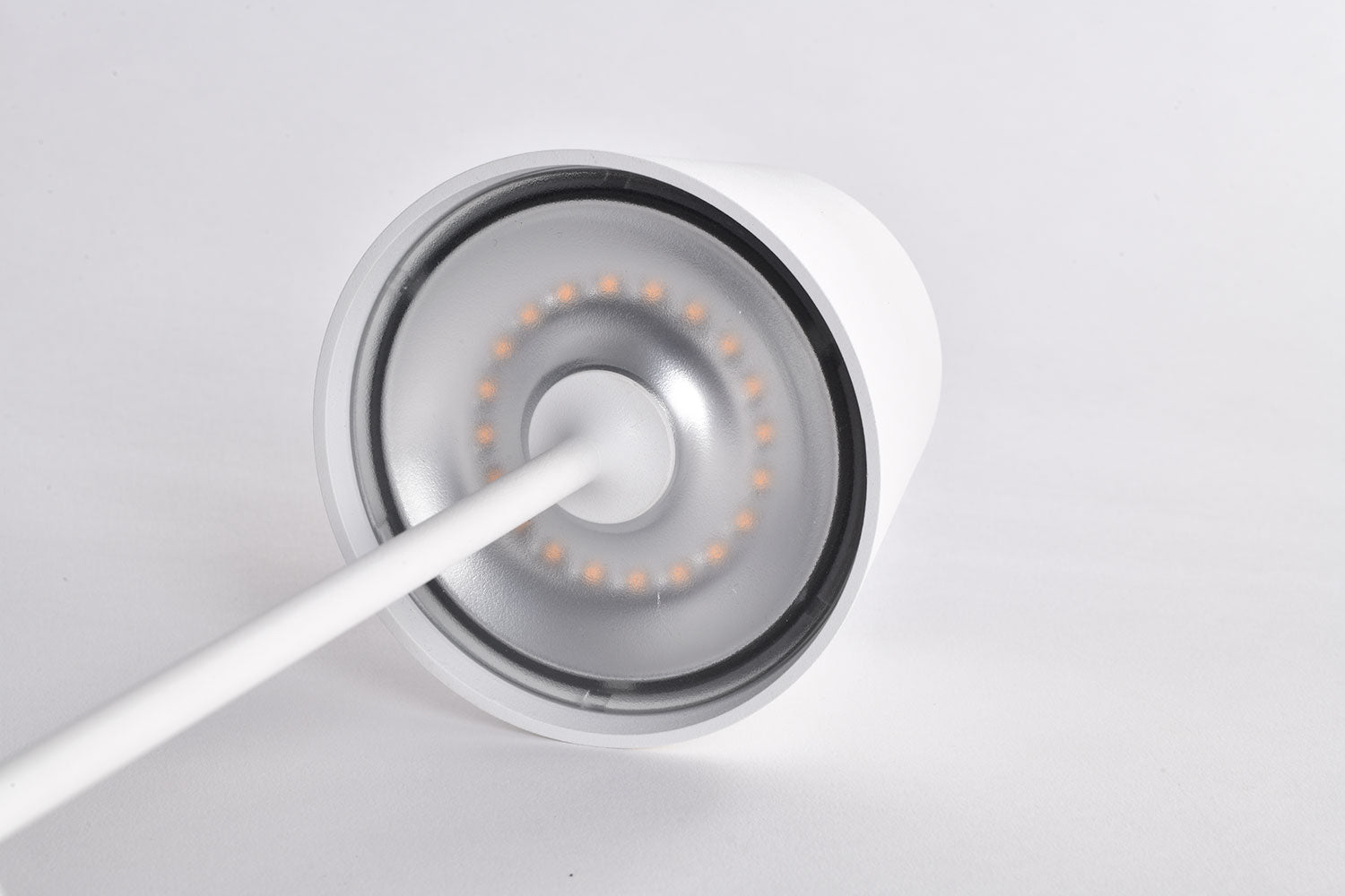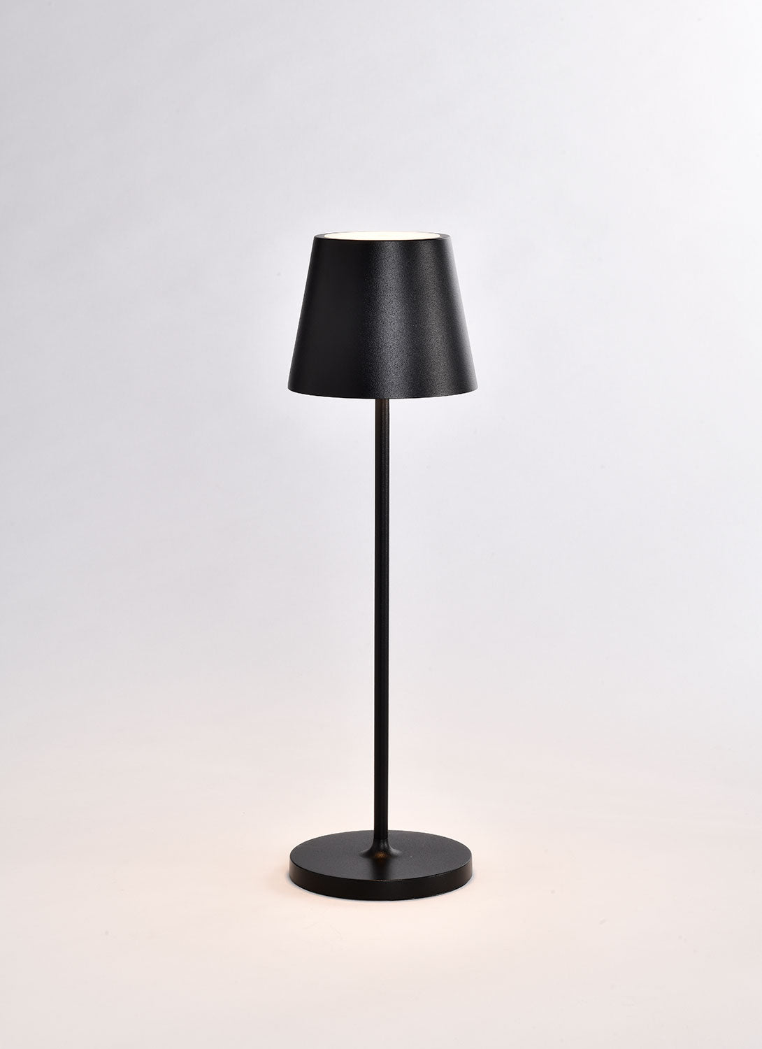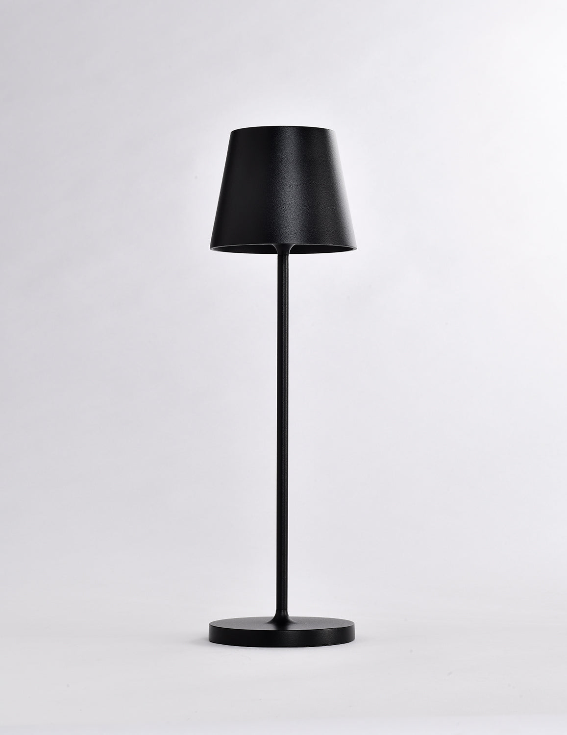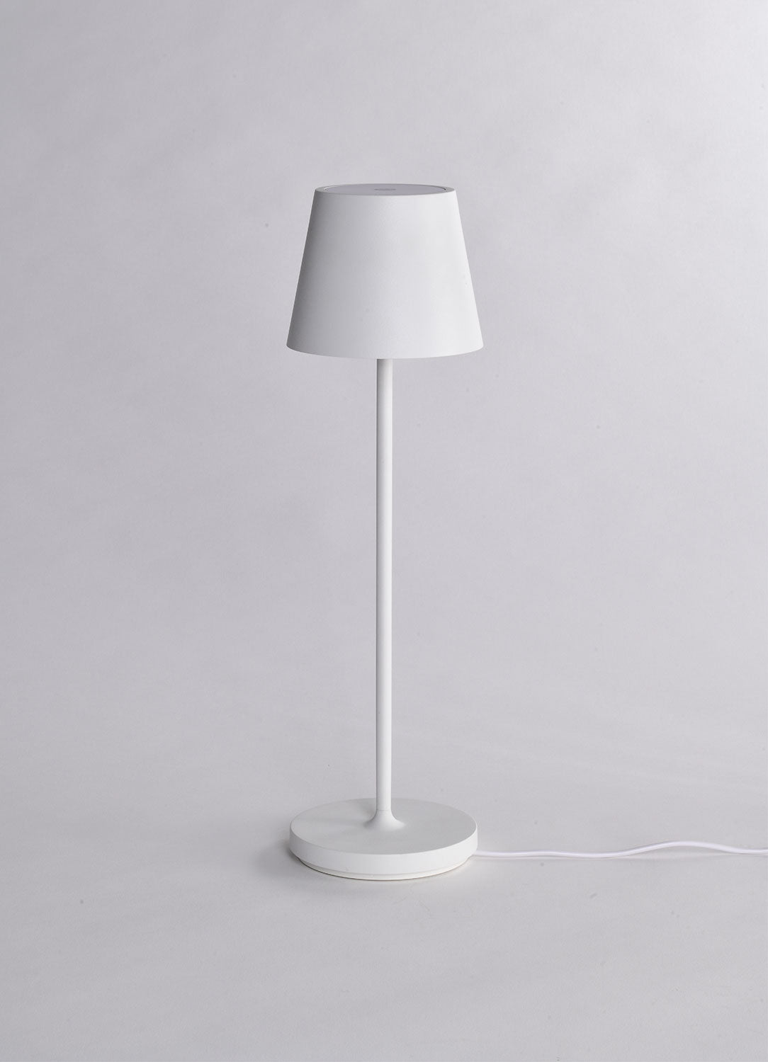 Mossa is a versatile, portable table lamp with a sleek, contemporary design that complements any space, including bedrooms, bars, restaurants, and reading areas. Rechargeable via a USB base, it features energy-efficient LED technology and a touch-sensor on top for stepless dimming and three-stage color temperature adjustments. With an IP54 rating, it is suitable for outdoor and wet environments, making it perfect for commercial use. The cone-shaped shade and durable powder-coated aluminium base provide a chic look, while its wireless design offers maximum flexibility, delivering adjustable, comfortable lighting for various applications.